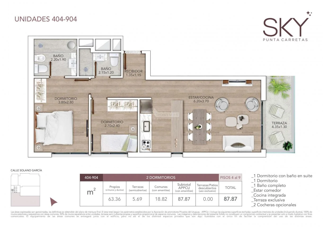 404 a 904) 63,36m área propia + 5,69m terraza semicubierta + 18,82m área común = 87,87m Total