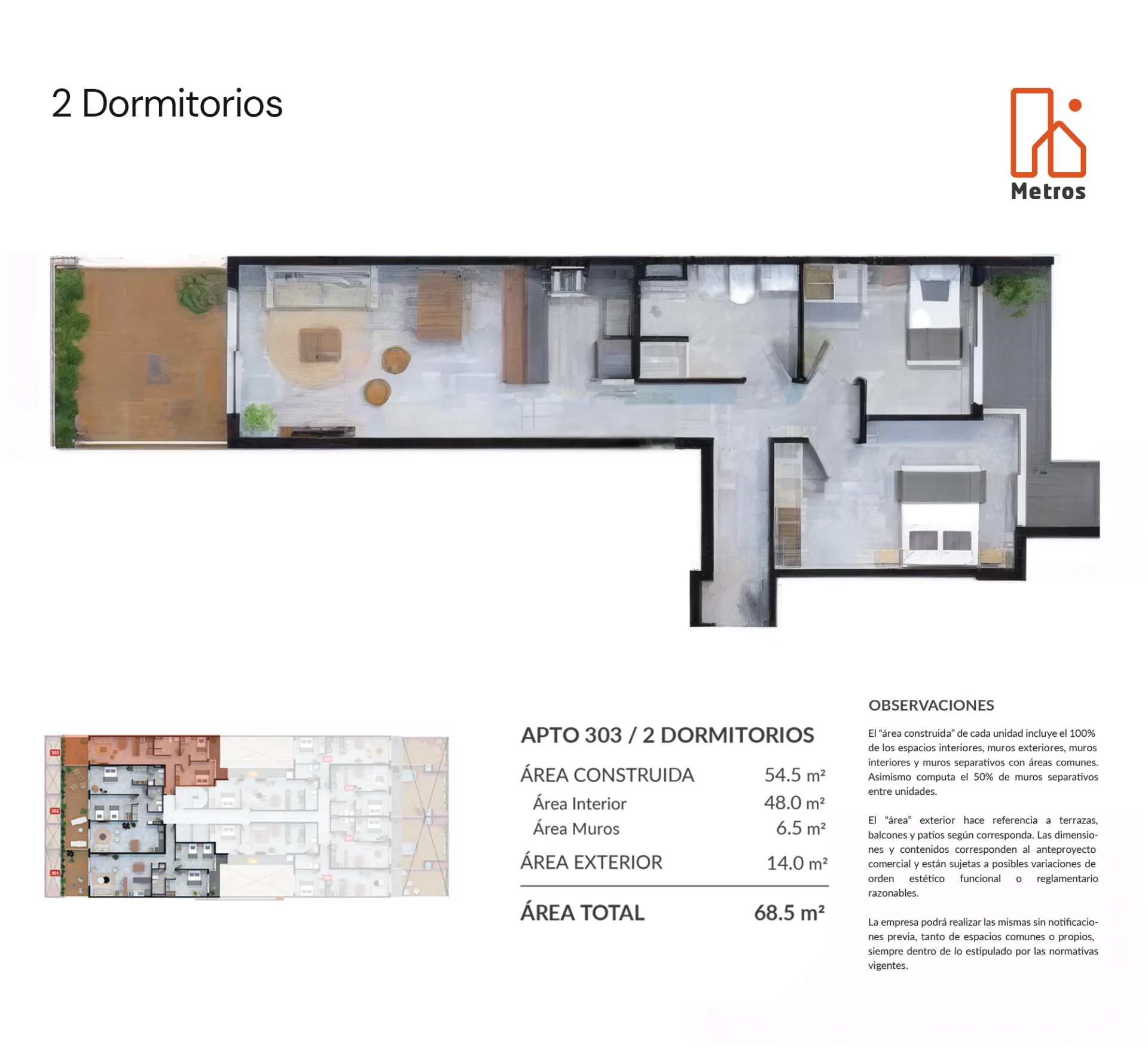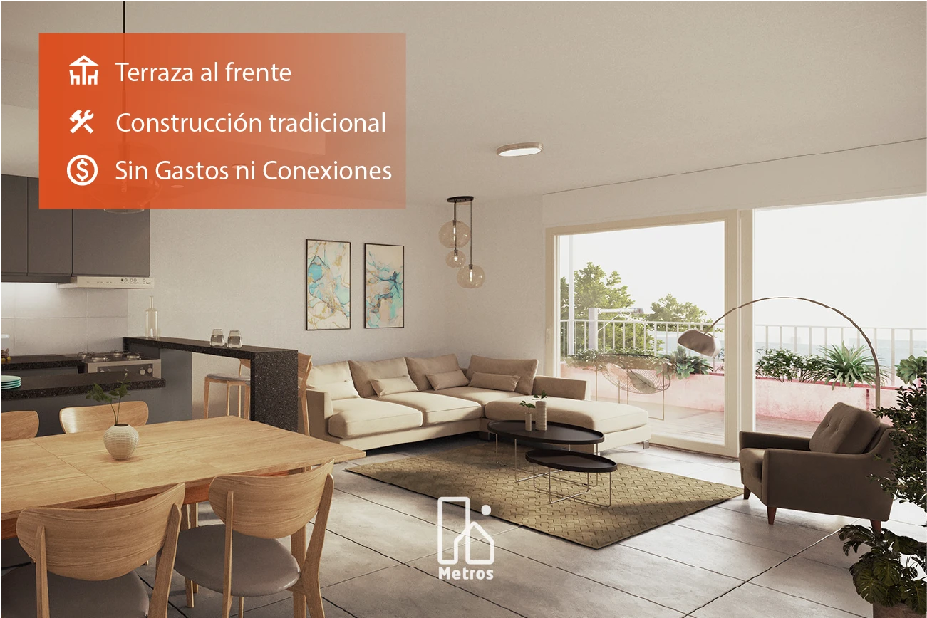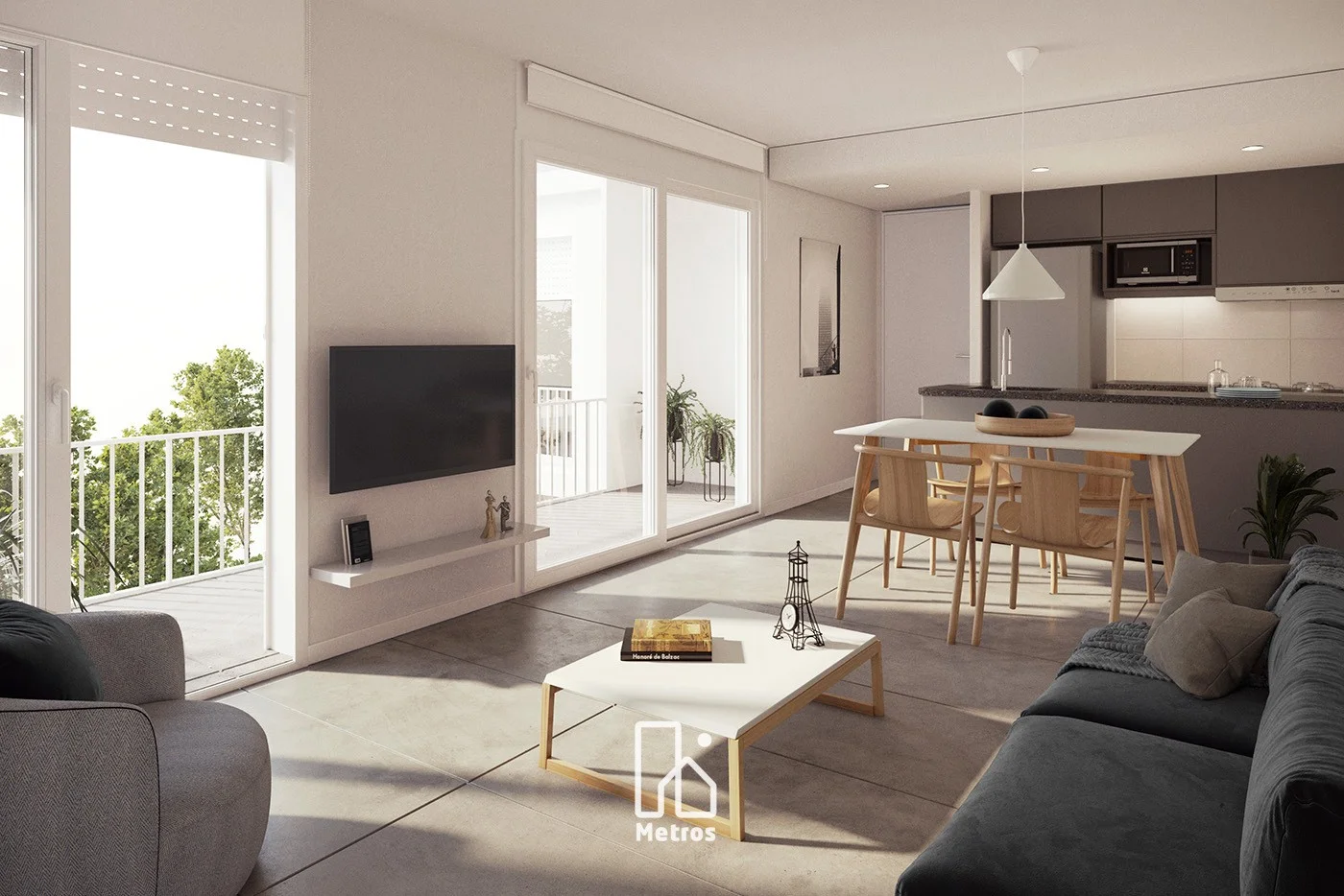 DESTACAMOS Terraza al frente + 2da terraza • Orientación Noreste • Construcción Tradicional (SIN yeso) • ¡NO pagas gastos de ocupación ni conexiones! • Ubicación excepcional con todas las comodidades LA ZONA Punto privilegiado a 2 cuadras de Ellauri y de Bv. Artigas. Cerca de la rambla y del Parque Villa Biarritz, ideal para hacer deporte y actividades al aire libre. ¡Todas las comodidades y excelente conectividad! Todos los servicios a tu alcance sin necesidad de moverse en auto, todo a menos de 3 cuadras: supermercados, shopping, universidades, centros educativos y deportivos, gastronomía y más. Una zona comercial muy solicitada con todo lo que necesitas cerca. EL EDIFICIO - RU Un edificio de 5 pisos, de apartamentos monoambientes, 1 y 2 dormitorios. Construido con materiales de alta calidad y diseño, en el mejor punto de Punta Carretas. Entrega estimada Octubre 2026. Cuenta con 2 Barbacoas en azotea con parrillero y terrazas + Solarium • Gimnasio • Laundry • Seguridad AMBIENTES 2 dormitorios • Living comedor • 2 Terrazas • Cocina integrada en L + desayunador • Baño completo • Garaje opcional EL APARTAMENTO Cuenta con 62m2 totales, 48m2 internos + terrazas de 14m2, ubicado en Piso 3. El living comedor es amplio y cuenta con salida a una linda terraza al frente del edificio, con orientación NorEste, muy luminoso. Ideal para colocar muebles de exterior y ampliar el área social. La cocina está integrada al living comedor, con un formato en L incluye muebles de mesada y aéreos de melamínico, como barra desayunador. 2 dormitorios separados del área social ambos con salida a una segunda terraza, con grandes ventanales que dejan entrar mucha luz. Cuentan con placard. La construcción es 100% tradicional (no yeso). Cuenta con Aberturas Aluminio DVH con cortina de aluminio. Los pisos son vinílicos simil madera y en baños y cocina los revestimientos son de porcelanato. Cuenta con previsión para calefones, lavarropas y aire acondicionado. Para el ingreso cada apartamento cuenta con portero eléctrico individual. PRECIOS Y GASTOS Garajes desde U$D 26.600 Gastos Comunes estimados: $8.000 Precios son al Contado (o minimo 80%), incluyen un 5% de descuento aprox. Se puede pagar financiado en cuotas durante la obra, en este caso el precio es superior al precio contado publicado. ¡Sin gastos de ocupación ni conexiones! Comisión Inmobiliaria: 3% + iva ¡Te deseamos suerte en tu búsqueda, y estamos para ayudarte tanto con esta propiedad o también para ayudarte buscando otras opciones en todo el mercado! No dudes en contactarnos. Inmobiliaria Metros Consulta nuestra web y redes sociales para encontrar otras oportunidades. Instagram: metros.inmobiliaria