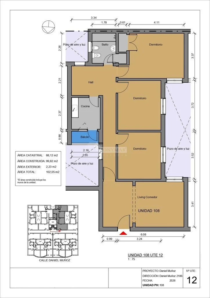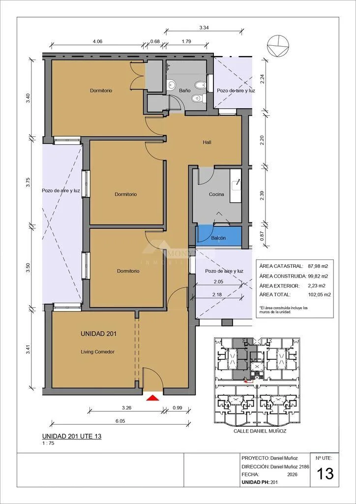 101 a 201 - 108 a 208) 99,82m2 área propia + 2,23m2 Balcón = 102,05m2 Totales.