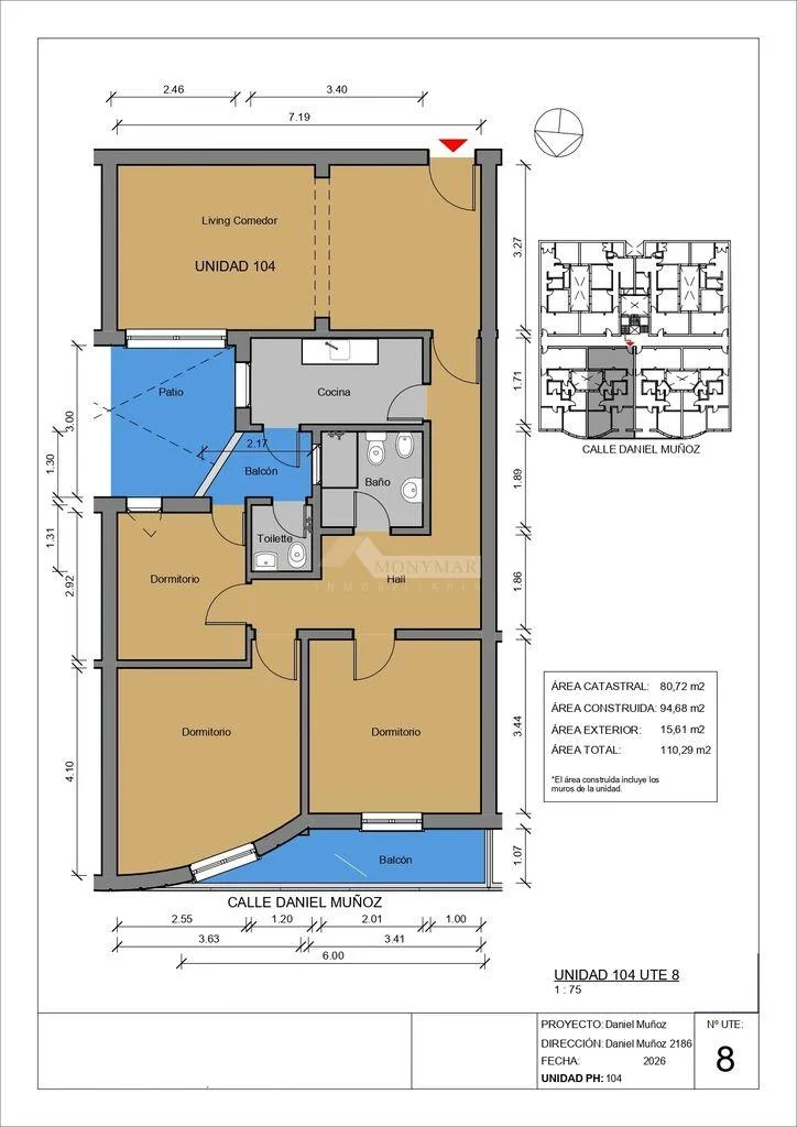 104 - 105) m2 área propia + m2 Balcón = 110,29m2 Totales.
