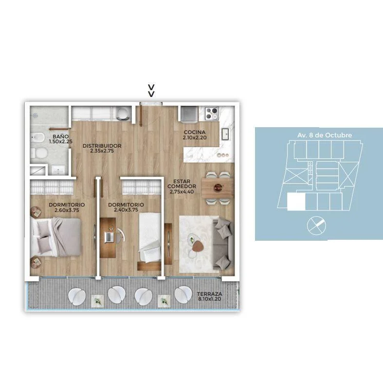 Living comedor con terraza, cocina integrada, 2 dormitorios y 1 baño completo.