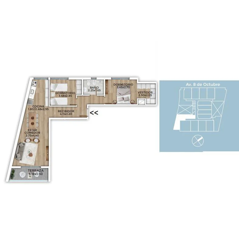 Living comedor con terraza, cocina integrada, 2 dormitorios y 1 baño completo.
