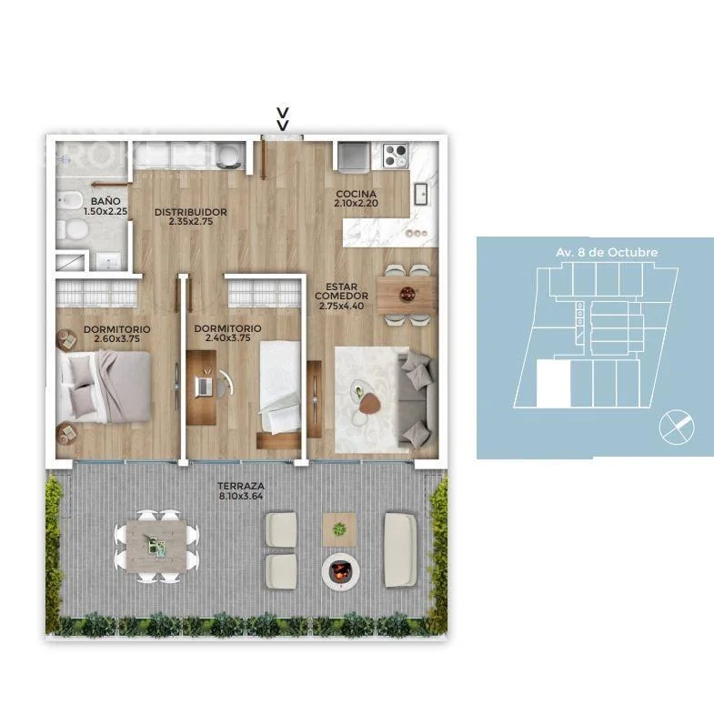 Living comedor con cocina integrada, 2 dormitorios y 1 baño completo.