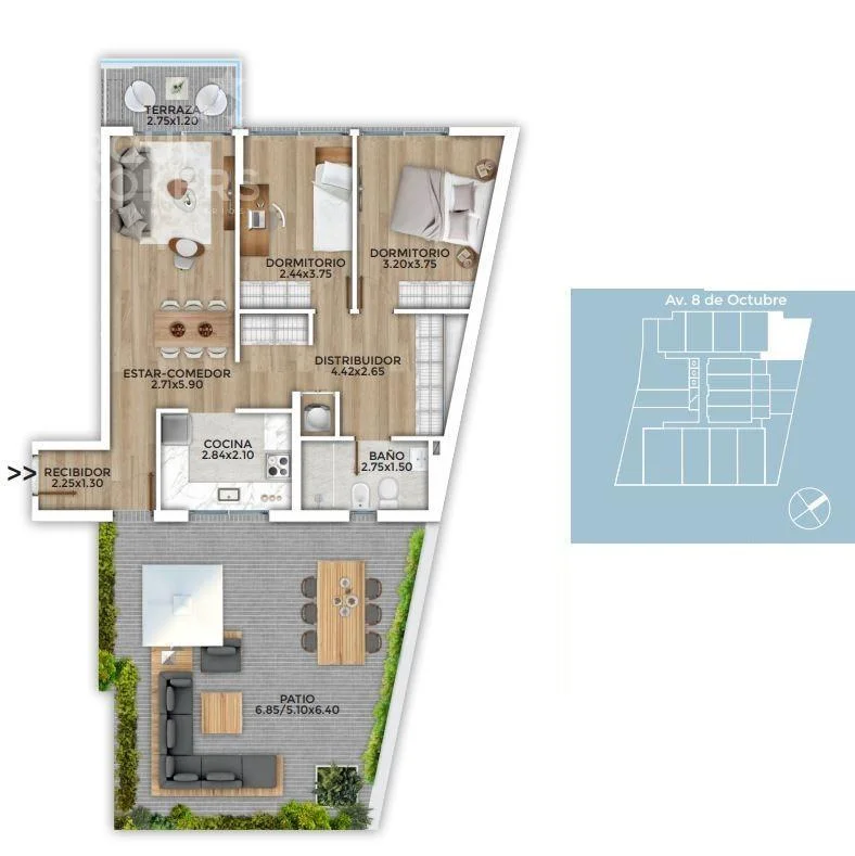 Living comedor con terraza, cocina integrada, 2 dormitorios y 1 baño completo.