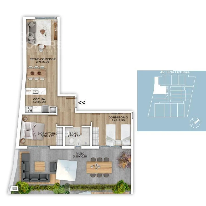 Living comedor con cocina integrada, 2 dormitorios y 1 baño completo.