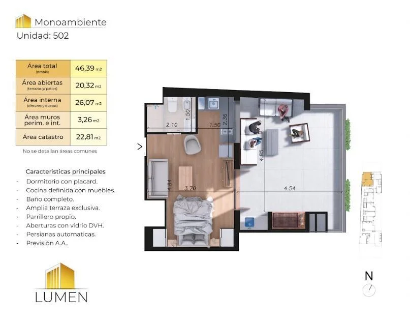 La unidad cuenta con 26.07 m² interiores, 20.32 m² de terraza, logrando un total de 46.39 m² muy bien aprovechados, con una distribución eficiente que maximiza la luz natural y el espacio.