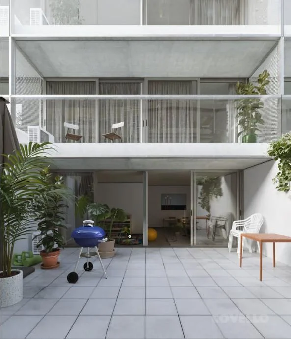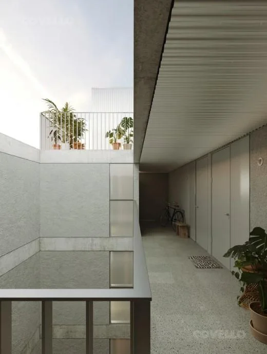El conjunto se organiza mediante pasarelas hacia un patio interior, cowork en planta baja y terraza con parrillero con vista al río, además de todos los beneficios de Vivienda Promovida (exoneración de ITP, IVA e IRPF por alquileres).
