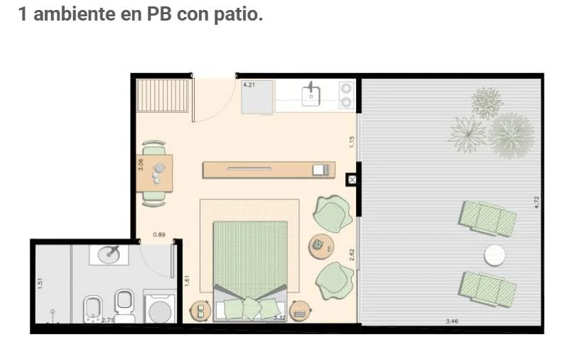 - Superficie total: 42m² (25 m² cubiertos y 17 m² descubiertos)