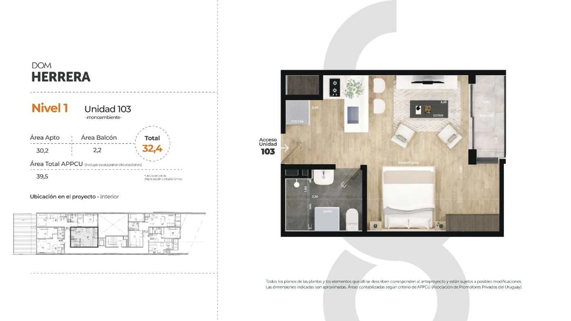 Corredor Responsable: - Contacto: Mónica Volkmann Bares VENTA EN POZO BARRIO LA BLANQUEADA UNIDAD MONOAMBIENTE NUMERO 103, CON BALCON, ORIENTACION SURESTE, DISPOSICION CONTRA FRENTE. CONSTRUCCIÓN BAJO LEY DE VIVIENDA PROMOVIDA; GARAGES OPCIONALES Excelente proyecto de diseño que combina vida urbana y sustentable, desarrollado en 7 niveles, 6 pisos de apartamentos en una inmejorable ubicación en La Blanqueada, sobre Avda. Dr. Luis Alberto de Herrera esquina Urquiza, con excelente conectividad, a metros de las principales avenidas y Shopping Tres Cruces y Nuevo Centro, zona en pleno crecimiento, amparado bajo la Ley de Vivienda Promovida, con las correspondientes exoneraciones tributarias de la Ley 18.795: -Exoneración ITP (2% sobre el valor Catastral) -Exoneración IRAE/IRPF sobre las rentas generadas de los alquileres por 10 años -Exoneración del Impuesto al Patrimonio FECHA DE ENTREGA: MARZO 2027 +7 niveles +35 apartamentos, 4 unidades por piso +18 sitios de estacionamiento (abiertos y techados) con previsión para carga de vehículos eléctricos +Tipología Frente y Contra Frente +Espacios enjardinados y Espacio para bicicletas +Rooftop (nivel 8) con 2 parrilleros abiertos de uso común +Gimnasio y Sala de cowork +Garajes opcionales en planta baja (consulte disponibilidad y precios) +EDIFICIO CON CERTIFICACION \\\"MAS\\\" Programa LSQA Uruguay (sociedad destacada entre LATU y QUALITY Austria) que redefine los estándares de construcción sostenible. Este programa garantiza eficiencia energética, ahorro de agua y ambientes interiores saludables en nuevas construcciones. Además, incorpora un proceso de diseño y construcción eficiente en el uso de recursos, demostrando un firme compromiso con el cuidado del medio ambiente. Forma de pago: 80% al firmar la promesa de compra venta y 20% contra la entrega; consulte por otras formas de pago Gastos de ocupación: 4% (no incluido en el precio) Gastos comunes estimados $2.500 mensuales Inmejorable ubicación, rodeado de variedad de servicios, muy buena conectividad y trasporte público a todas partes de la capital. Es una muy atractiva oportunidad para quien busca rentabilidad o su primer vivienda, a precios pre venta con descuentos lanzamiento! Dirección: Avda. Dr. Luis A. de Herrera 2687, La Blanqueada, Montevideo COMPARTIMOS CON TODOS LOS COLEGAS COMISION INMOBILIARIA 3% MAS IVA SOBRE PRECIO DE VENTA Cada Oficina es de propiedad, gestión y desarrollo independiente La presente publicación describe las características esenciales del inmueble, debiéndose consultar al responsable de la operación por la eventual actualización de las medidas, descripciones arquitectónicas y funcionales, servicios, impuestos, precios y demás información, cuyos valores son aproximados.