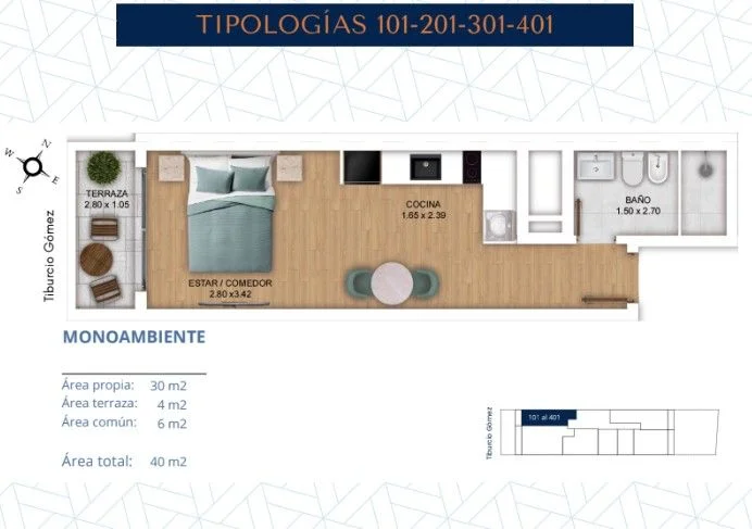 ¡TreeHouse Bienes Raíces vende! Monoambiente con terraza en Buceo. Edificio en construcción entrega Diciembre 2026. Ubicado sobre la calle Tiburcio Gómez, esquina Rizal. Con rápido y fácil acceso a distintos puntos de Montevideo e interior del país, a pocos metros del WTC, Montevideo shopping, rambla y todos los servicios. Unidad 301: Se trata de una planta de 34 m2 totales: 30 m2 internos y 4 m2 de terraza. Dispuesta en tercer piso, hacia el frente, con orientación oeste. Cuenta con estar / comedor, cocina integrada con muebles bajo y sobre mesada. Baño completo y terraza. Para el disfrute de sus residentes el edificio contará con barbacoa con parrillero, cowork y lavadero. Además contará con cámaras, portero eléctrico y rejas de seguridad. Se entrega equipado con: mesada de granito, anafe y campana extractora de acero inoxidable, grifería y muebles de cocina. Gastos de ocupación 4%. Cocheras opcionales. Consulta por distintas tipologías, unidades monoambientes y 1 dormitorio. . Caracteristicas: ESTAR, LIVING COMEDOR, SOLARIUM, PERMITE MASCOTAS, PLACARD EN COCINA, COCINA XINTEL (TBR-TBR-4092)