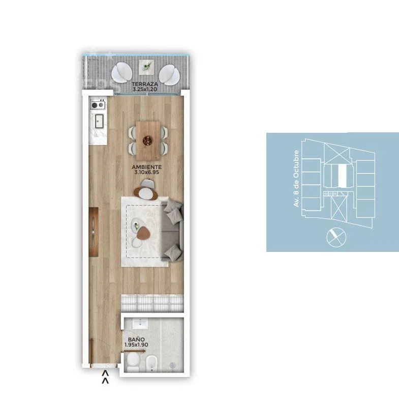 Monoambiente con terraza, cocina integrada y 1 baño completo.