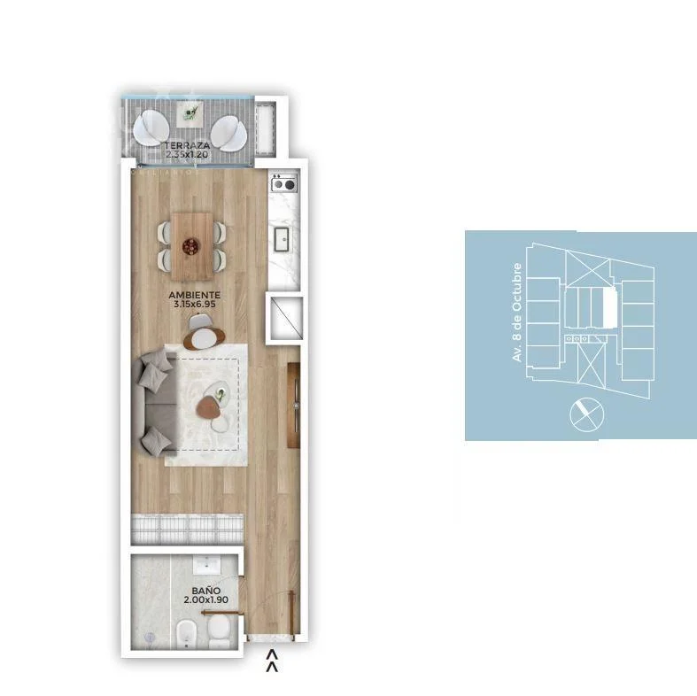 Monoambiente con terraza, cocina integrada y 1 baño completo.