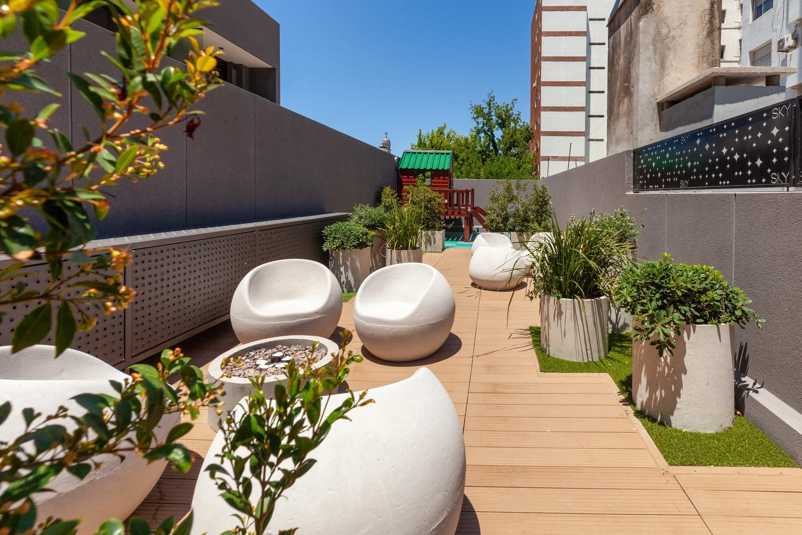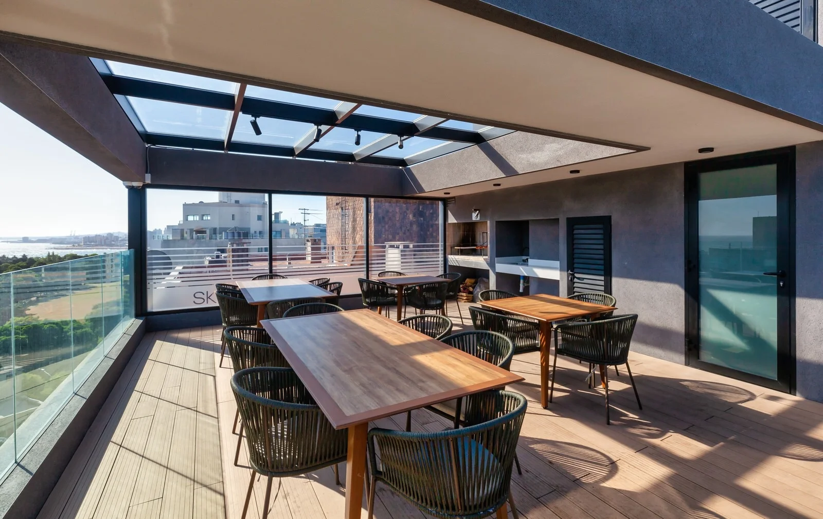 Parrillero en rooftop con amplio espacio para reuniones y vistas panorámicas.