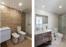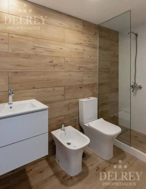 Baño con placares en madera natural y piletas de loza blanca. Inodoro pedestal con mochila, bidet ídem.