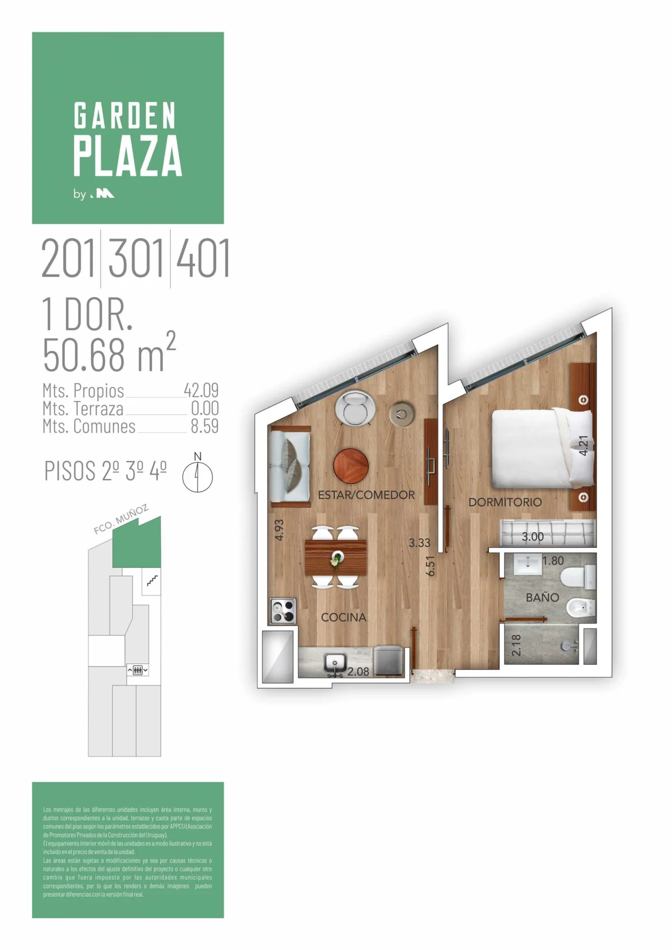 Corredor Responsable: - Contacto: Fabiana Steinberg Se vende apartamento a estrenar de 1 dormitorio ubicado sobre la calle Fco Muñoz esq. Pereira de la Luz. Piso 4 al frente con orientación norte, muy soleado. Living comedor con cocina integrada, ventanales con persianas. Dormitorio también al frente con persianas. Un baño completo. Aire acondicionado en living y dormitorio. El edificio cuenta con laundry. Consulte por opciones de cochera. Cada Oficina es de propiedad, gestión y desarrollo independiente La presente publicación describe las características esenciales del inmueble, debiéndose consultar al responsable de la operación por la eventual actualización de las medidas, descripciones arquitectónicas y funcionales, servicios, impuestos, precios y demás información, cuyos valores son aproximados.