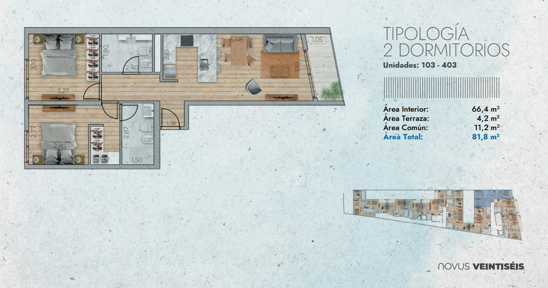 Corredor Responsable: - Contacto: Antonio Serrentino VENTA Apartamento en POCITOS 2 dormitorios con balcón/terraza en POZO Novus 26 - Fecha de entrega aproximada: Junio 2027 Precio correspondiente a Unidad 103 - Consulte por otras unidades y tipologías Ubicado sobre la calle Luis A de Herrera esquina 26 de Marzo, a pasos del World Trade Center, Montevideo Shopping, la Rambla, Playa de Pocitos y el Puertito del Buceo. Amenities: - Barbacoa - Gimnasio - Solárium - Recepción, vigilancia y seguridad - Garaje y bicicletero - Laundry - Calefacción con Losa Radiante Todas las unidades se entregan semi-equipadas con: - Aberturas DVH - Muebles (placares) en cocina, baño y dormitorios - Horno - Anafe - Campana extractora - Calefón - Cortina de enrollar eléctrica - Previsión para AC Cocheras disponibles desde USD 29.000 Cada Oficina es de propiedad, gestión y desarrollo independiente La presente publicación describe las características esenciales del inmueble, debiéndose consultar al responsable de la operación por la eventual actualización de las medidas, descripciones arquitectónicas y funcionales, servicios, impuestos, precios y demás información, cuyos valores son aproximados. Cada Oficina es de propiedad, gestión y desarrollo independiente La presente publicación describe las características esenciales del inmueble, debiéndose consultar al responsable de la operación por la eventual actualización de las medidas, descripciones arquitectónicas y funcionales, servicios, impuestos, precios y demás información, cuyos valores son aproximados.
