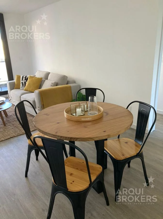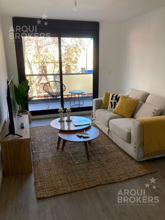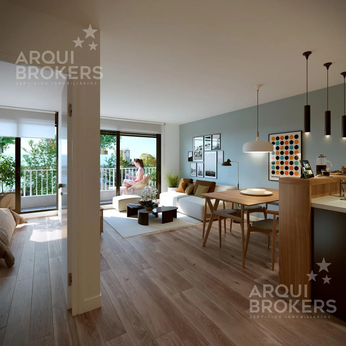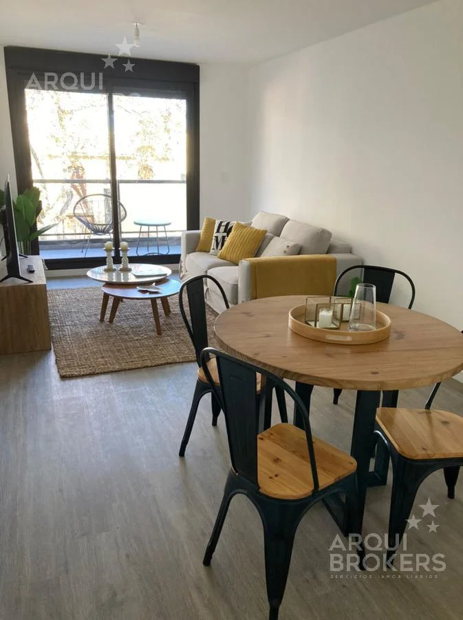 Living comedor con terraza, cocina integrada, 1 dormitorio y 1 baño.