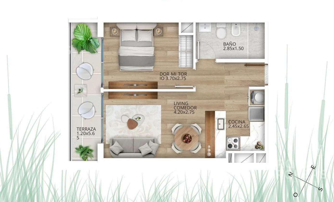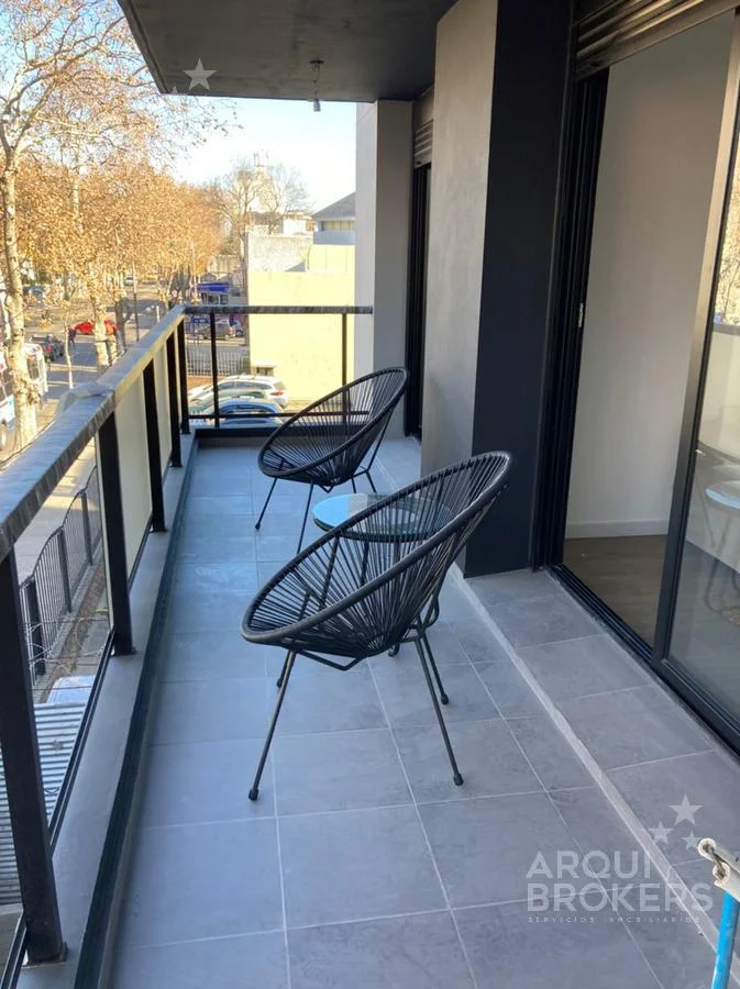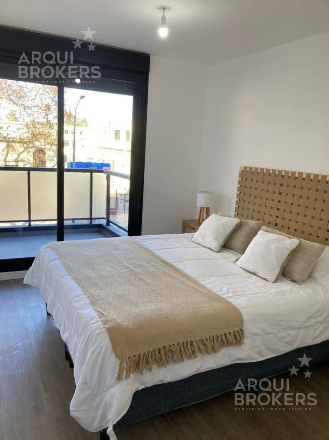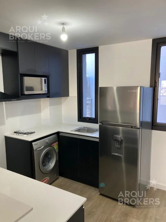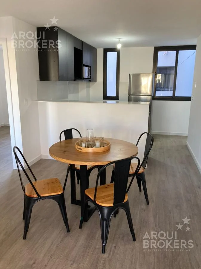 Living comedor con terraza, cocina integrada, 1 dormitorio y 1 baño.