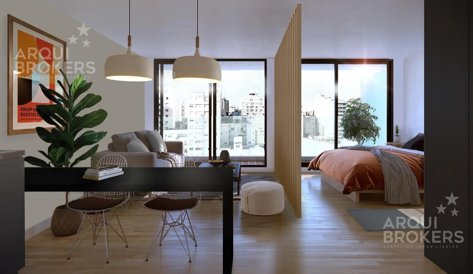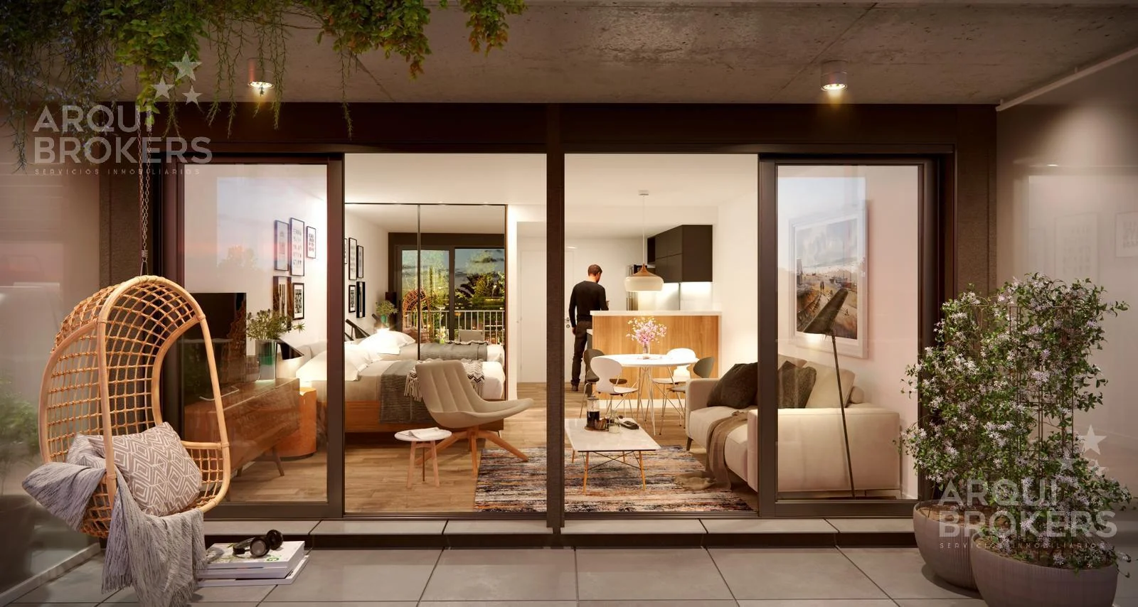 Living comedor y dormitorios con terraza al frente, Cocina integrada de concepto abierto con mesada en \"L\", conexión para lavadora y calefón, muebles aéreos y bajo mesada de gran calidad y 1 baño.