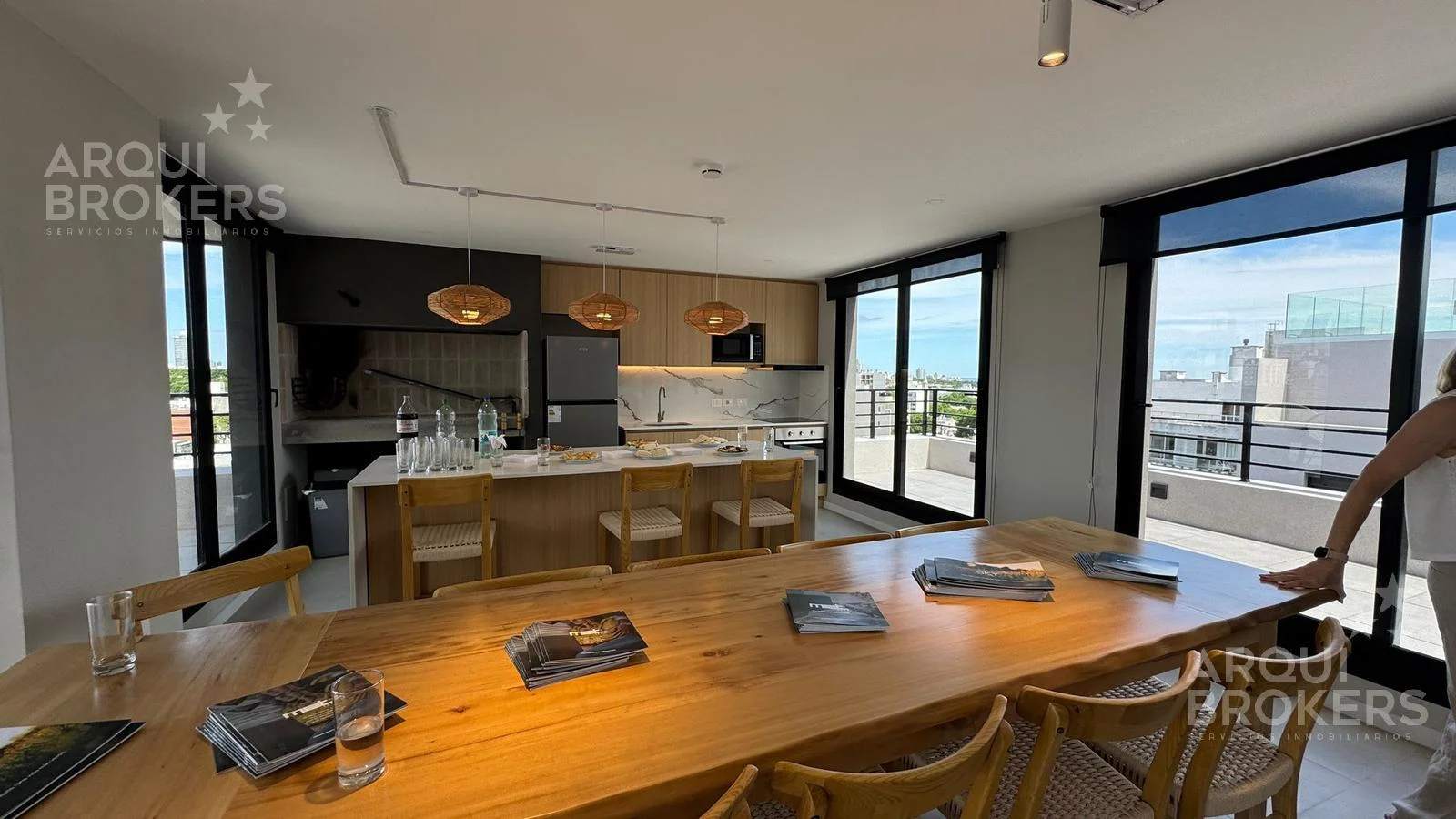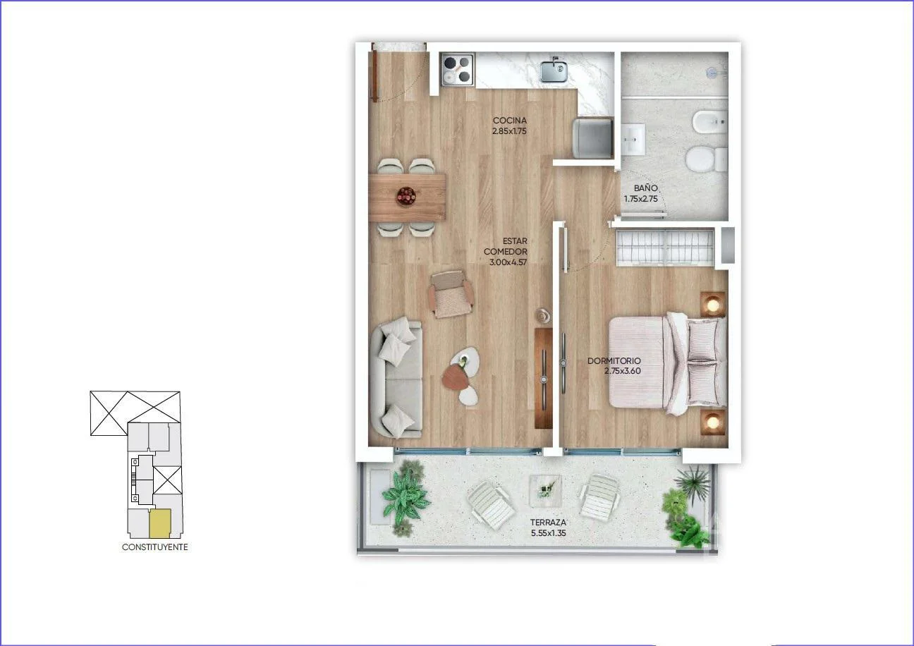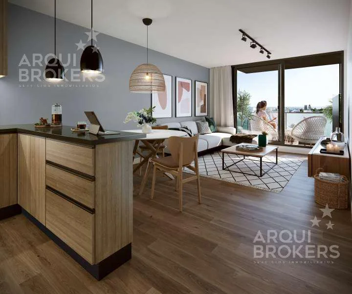 Living comedor con terraza, cocina integrada, 1 dormitorio y 1 baño completo.