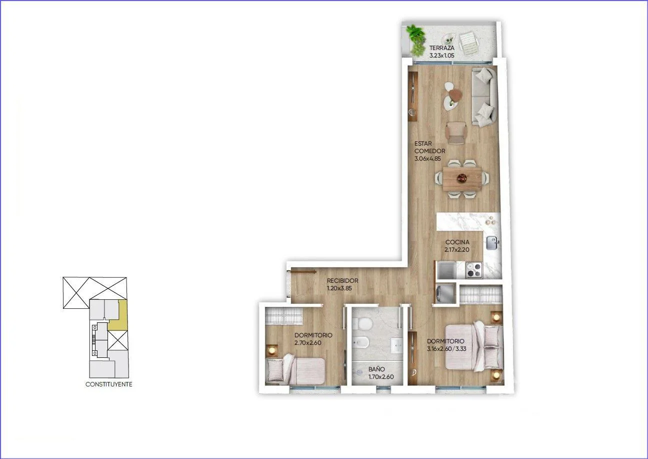 Living comedor con terraza, cocina integrada, 1 dormitorio y 1 baño completo.