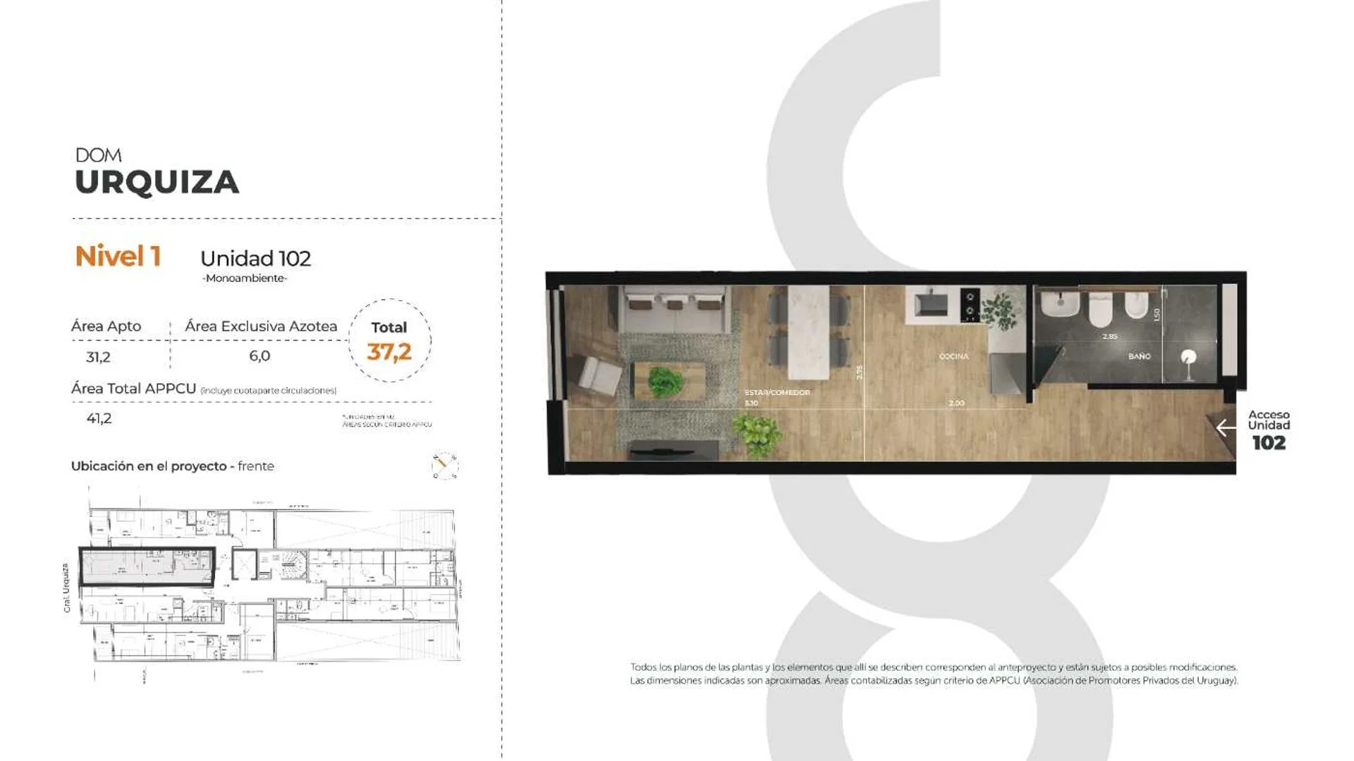 Corredor Responsable: - Contacto: Mónica Volkmann Bares VENTA EN POZO BARRIO LA BLANQUEADA UNIDAD MONOAMBIENTE NUMERO 102, CON ESPACIO EN AZOTEA DE USO EXCLUSIVO, ORIENTACION NOROESTE, DISPOSICION DE LA UNIDAD AL FRENTE, CONSTRUCCIÓN BAJO LEY DE VIVIENDA PROMOVIDA; GARAGES OPCIONALES La unidad publicada se trata de un apartamento tipología monoambiente (unidad 102), ubicada en primer piso, disposición al frente, con uso exclusivo de espacio en azotea (6 m2). Excelente proyecto de diseño que combina vida urbana y sustentable, desarrollado en 5 niveles, 24 apartamentos (tipología monoambientes, 1, 2 y 3 dormitorios), 12 lugares de estacionamiento, en una inmejorable ubicación en La Blanqueada, sobre Gral. Urquiza entre Estero Bellaco y Comandante Braga, con excelente conectividad, a metros de las principales avenidas y Shopping Tres Cruces y Nuevo Centro, zona en pleno crecimiento, amparado bajo la Ley de Vivienda Promovida, con las correspondientes exoneraciones tributarias de la Ley 18.795: -Exoneración ITP (2% sobre el valor Catastral) -Exoneración IRAE/IRPF sobre las rentas generadas de los alquileres por 10 años -Exoneración del Impuesto al Patrimonio FECHA DE ENTREGA: MAYO 2026 +5 niveles +24 apartamentos +12 sitios de estacionamiento +Tipología Frente, Contra Frente y Lateral +Azotea de uso exclusivo (asignadas a algunas unidades) +Rooftop con 2 barbacoas de uso común (una abierta y otra cerrada con parrilleros) +Sala de cowork +Garages opcionales en planta baja (consulte disponibilidad y precios) Forma de pago: 80% al firmar la promesa de compra venta y 20% contra la entrega; consulte por otras formas de pago Gastos de ocupación: 4% (no incluido en el precio) Gastos comunes estimados $2.000 mensuales Inmejorable ubicación, rodeado de variedad de servicios, muy buena conectividad y trasporte público a todas partes de la capital. Es una muy atractiva oportunidad para quien busca rentabilidad o su primer vivienda, a precios pre venta con descuentos lanzamiento! Dirección: Gral. Urquiza 2810, La Blanqueada, Montevideo Próximo a: +Parque Batlle +Universidad Católica +Instituto Crandon +Liceo Dámaso A. Larrañaga +Hospital Militar +Hospital de Clínicas +Casmu +Freshmarket COMPARTIMOS CON TODOS LOS COLEGAS COMISION INMOBILIARIA 3% MAS IVA SOBRE PRECIO DE VENTA Cada Oficina es de propiedad, gestión y desarrollo independiente La presente publicación describe las características esenciales del inmueble, debiéndose consultar al responsable de la operación por la eventual actualización de las medidas, descripciones arquitectónicas y funcionales, servicios, impuestos, precios y demás información, cuyos valores son aproximados.