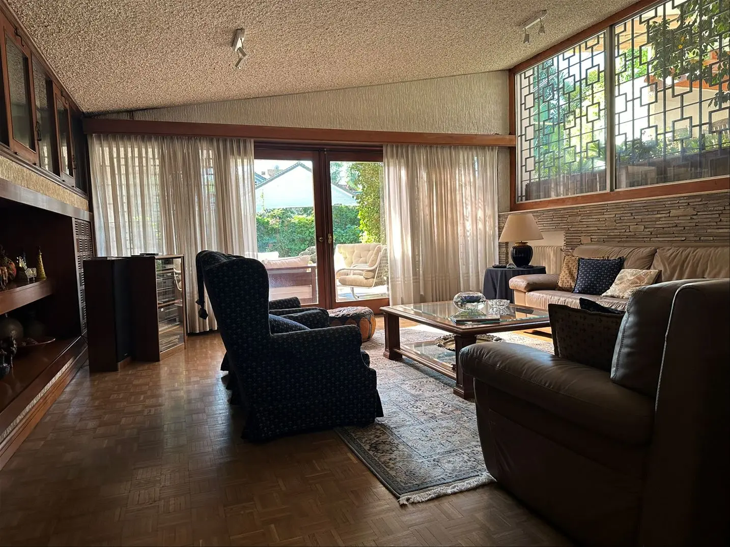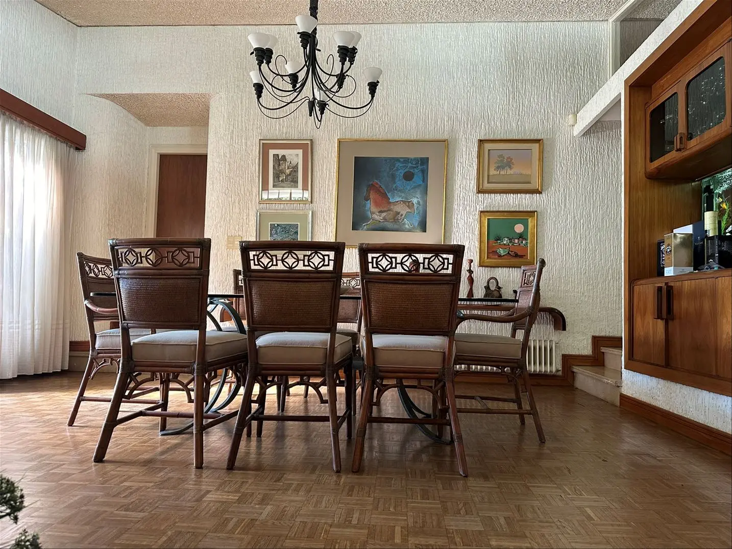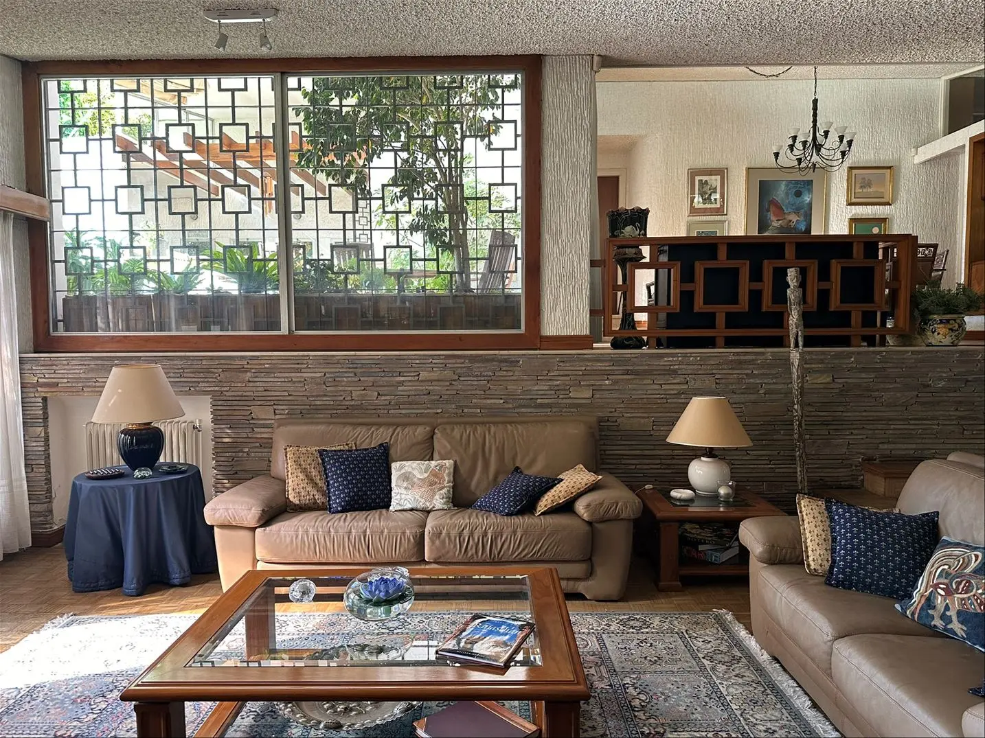Living y comedor en desnivel con pisos de parquet y ventanas en madera – rejas con diseño