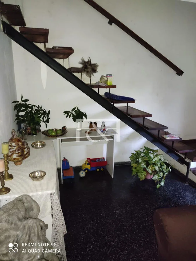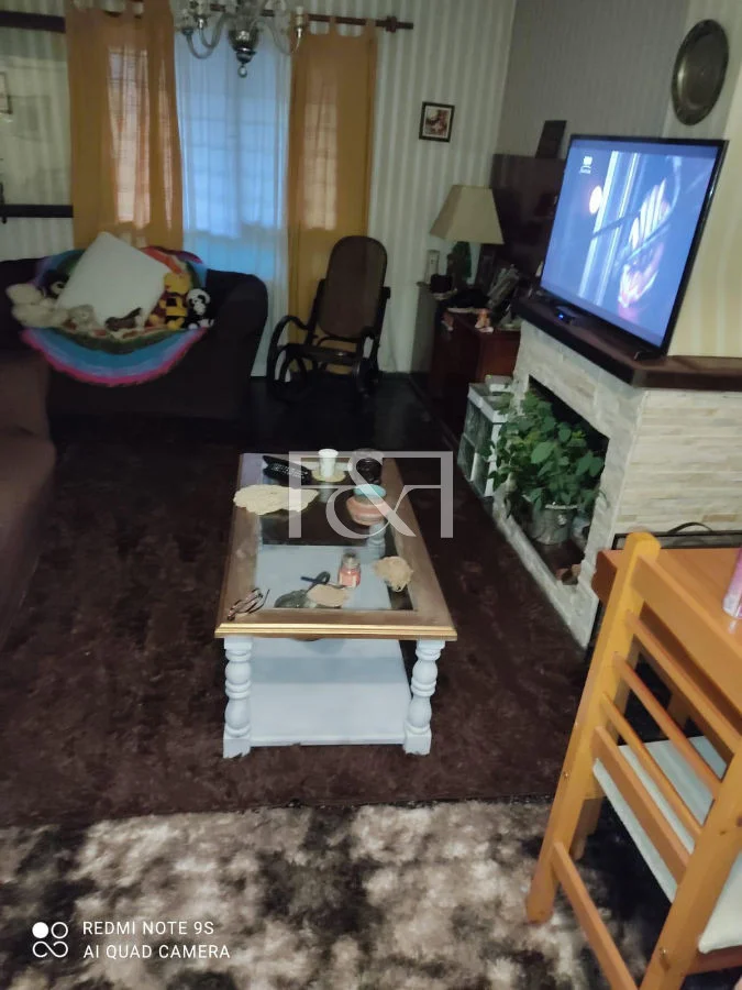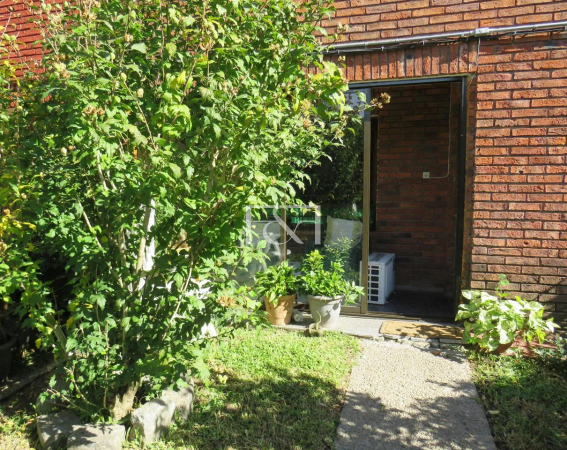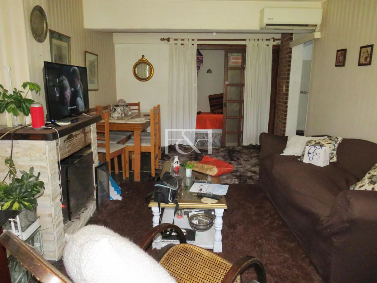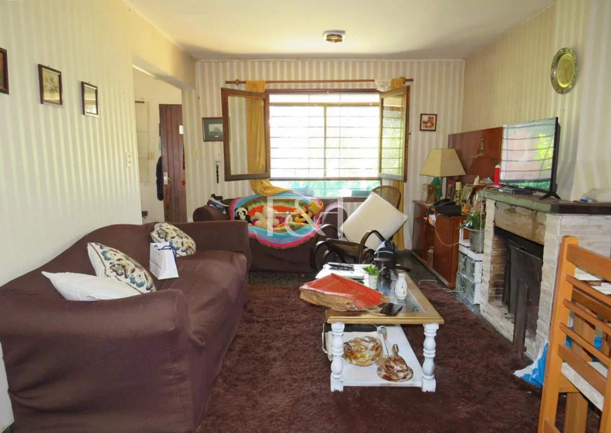 Planta baja con living comedor amplio y luminoso, hogar a leña con acceso a jardín delantero y reja perimetral.