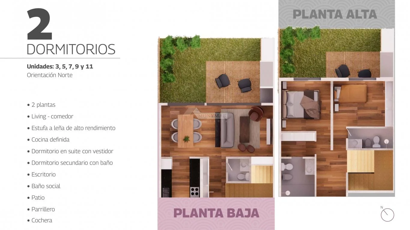 Unidades 11) 86m área propia con muros + 21m patio = Total 107m.