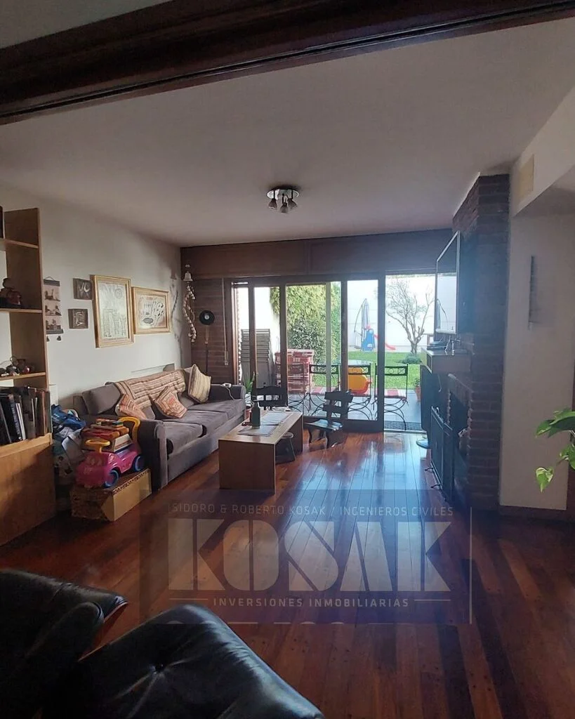 Estar diario con estufa a leña con ventanales y acceso al fondo