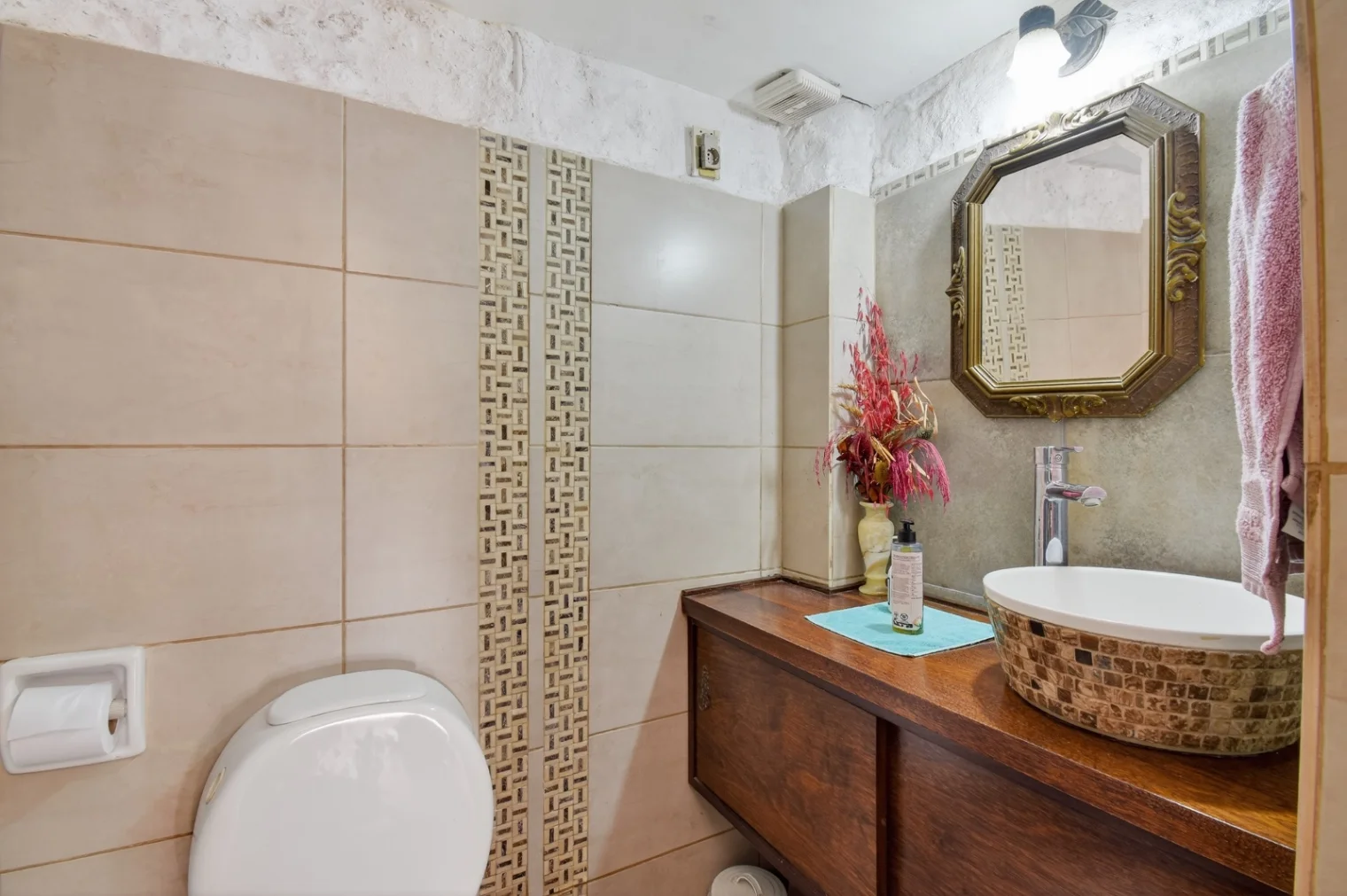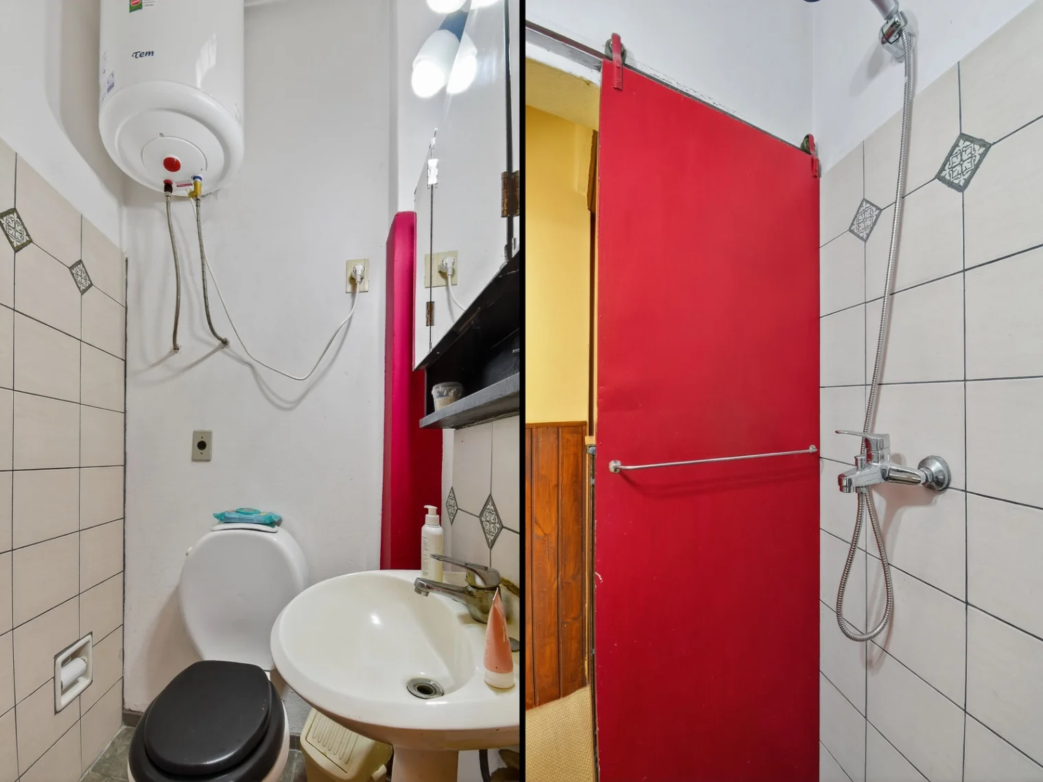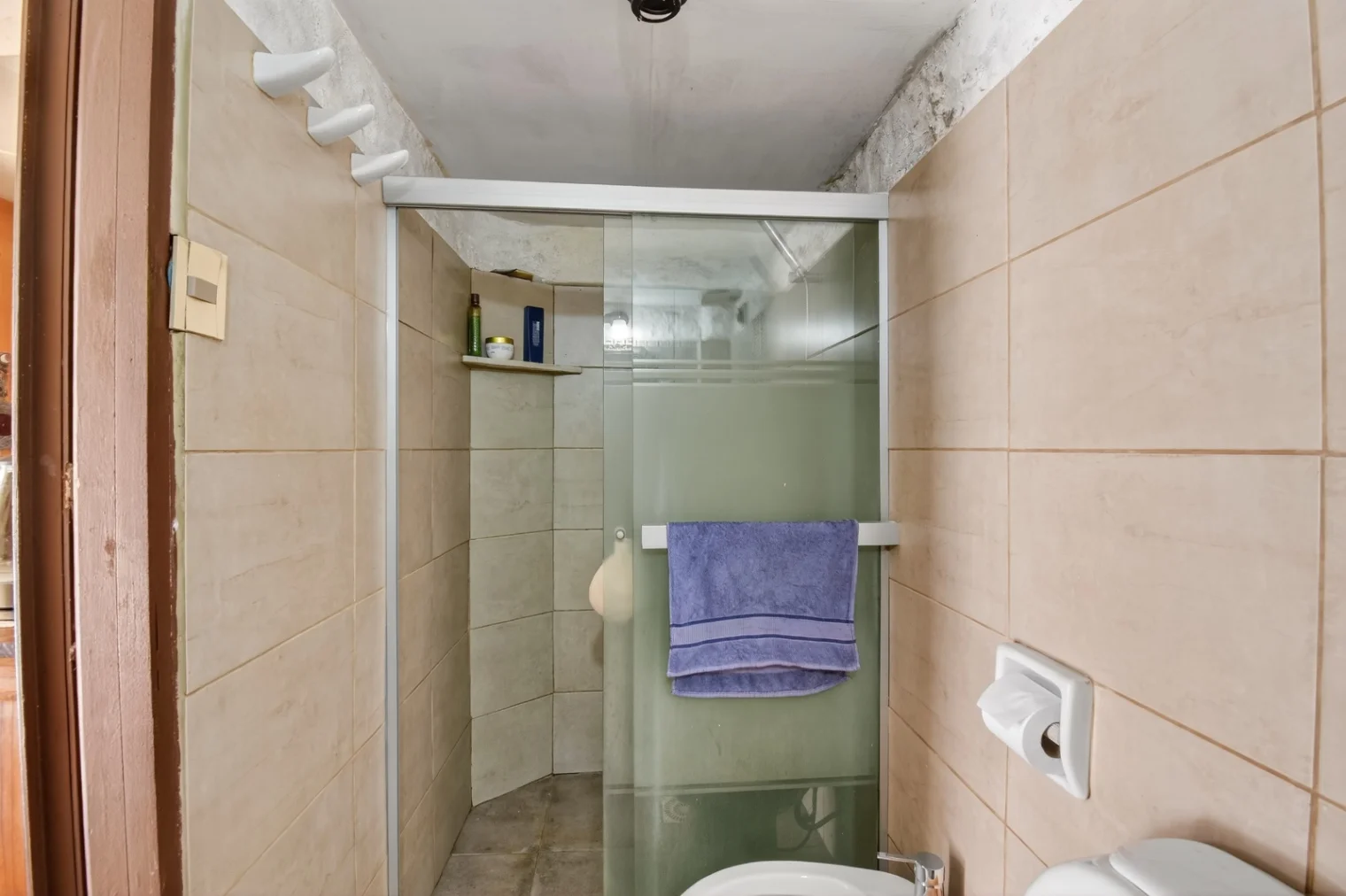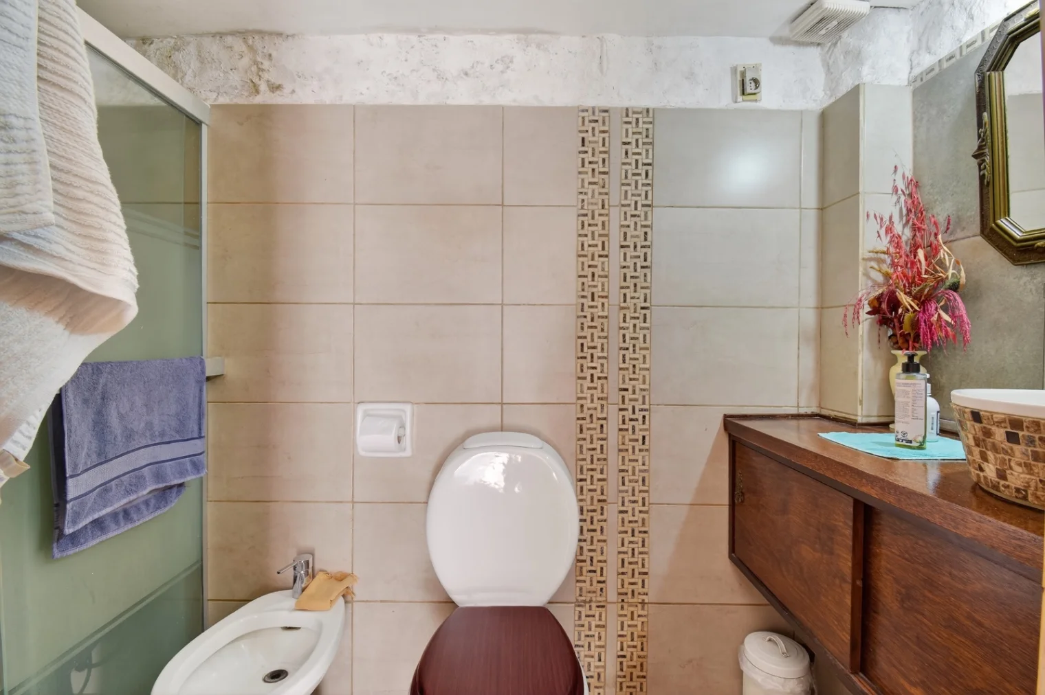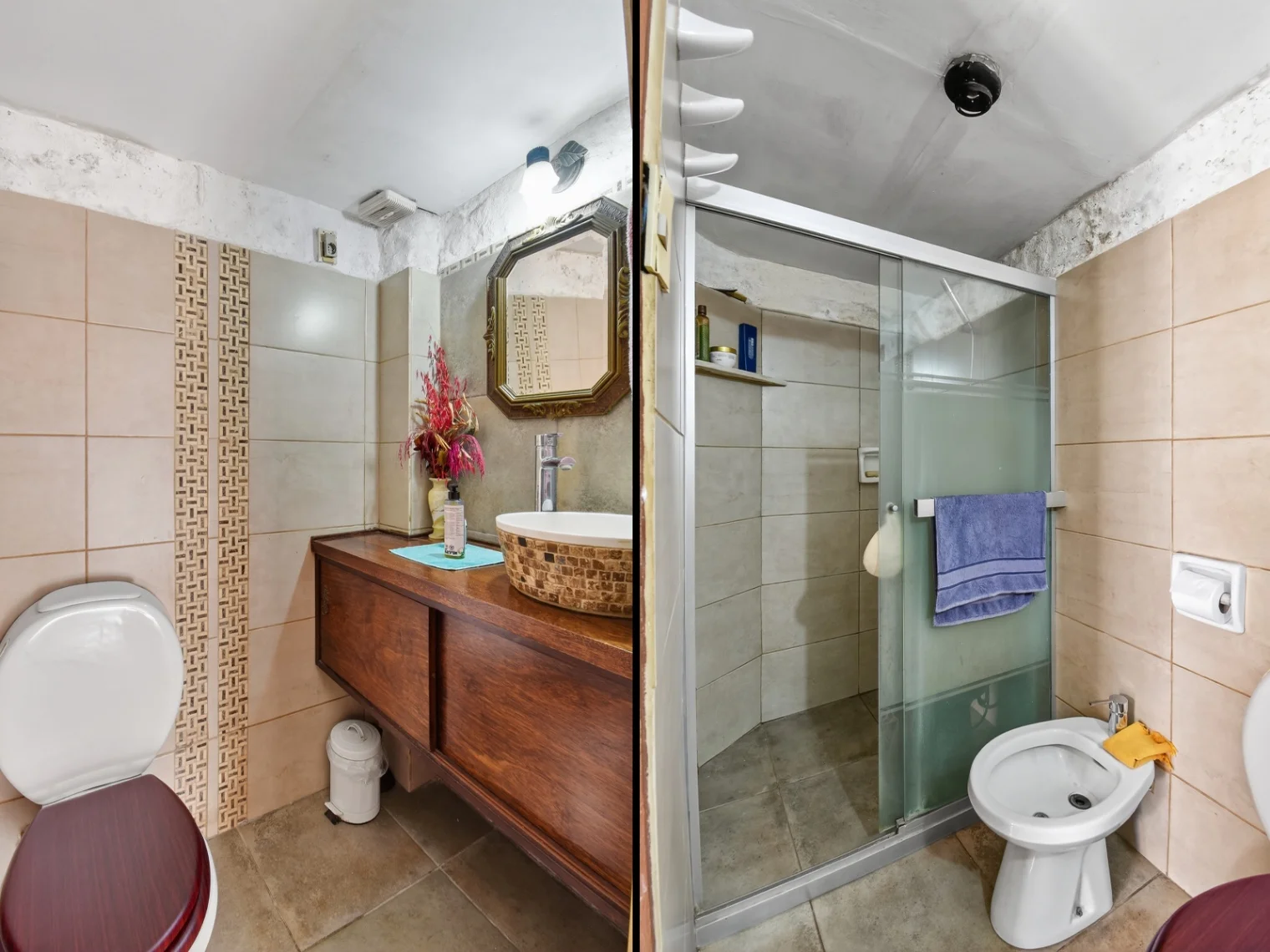 Baño completo con water, bidet, pileta de sobreponer y ducha con mampara.