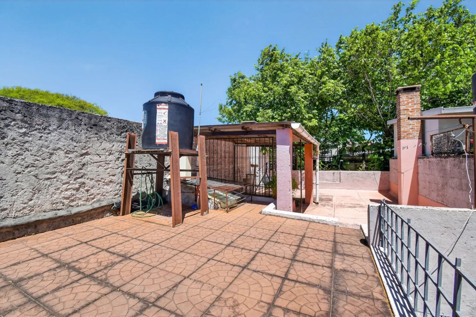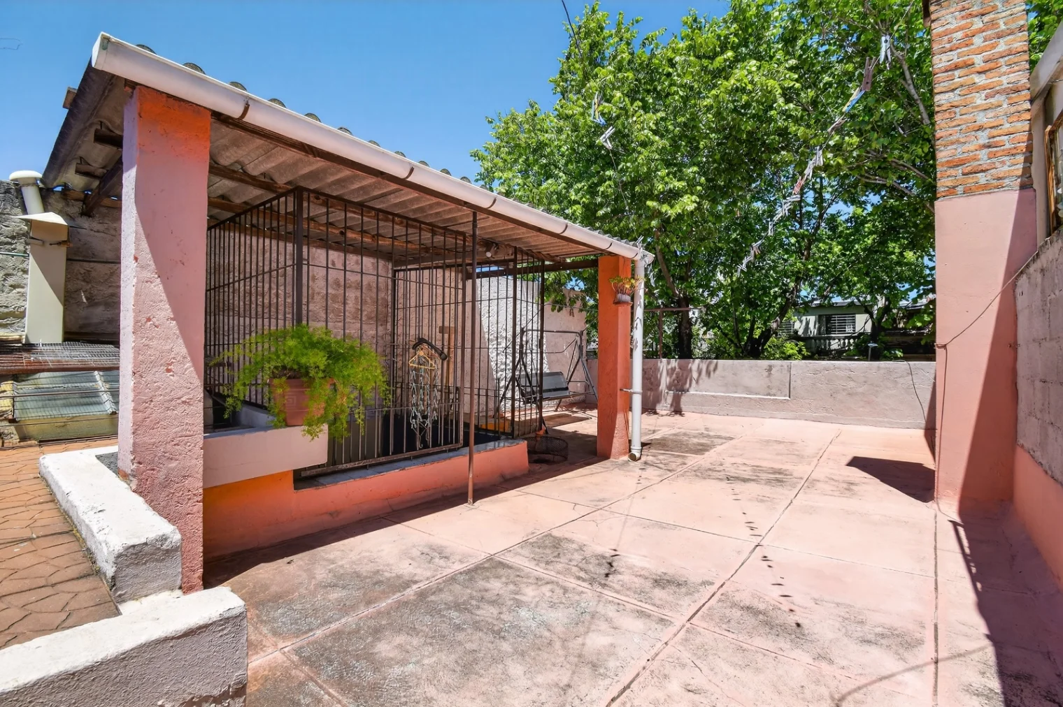 Espacio semicubierto con conexión para lavarropas y área de guardado.