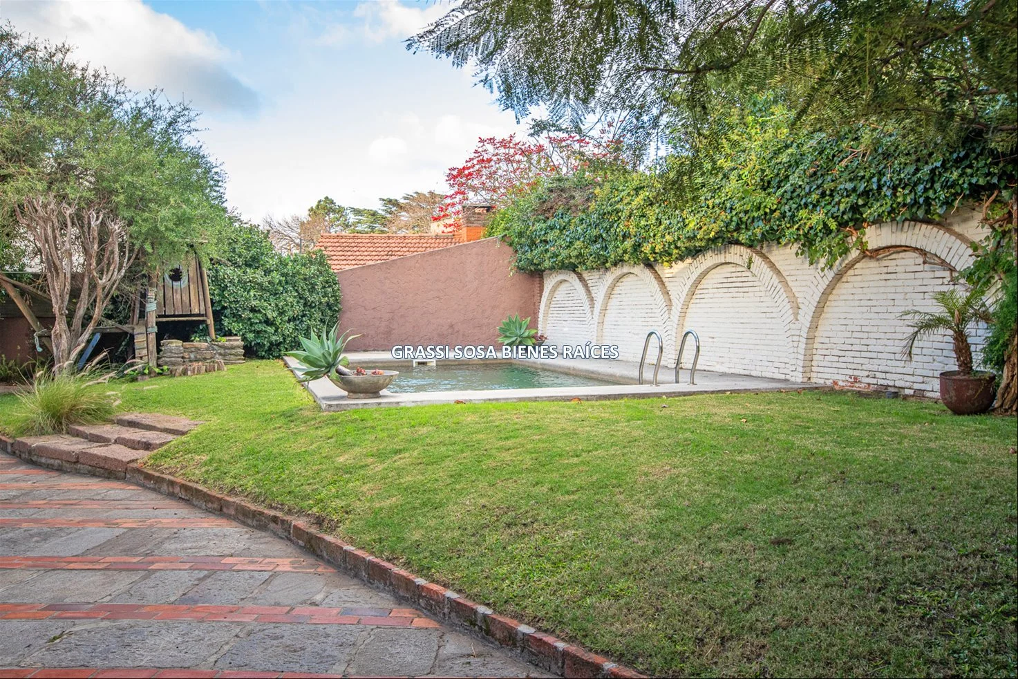 Hermoso fondo arbolado con gran piscina tradicional y una cálida barbacoa de muy buenas dimensiones,