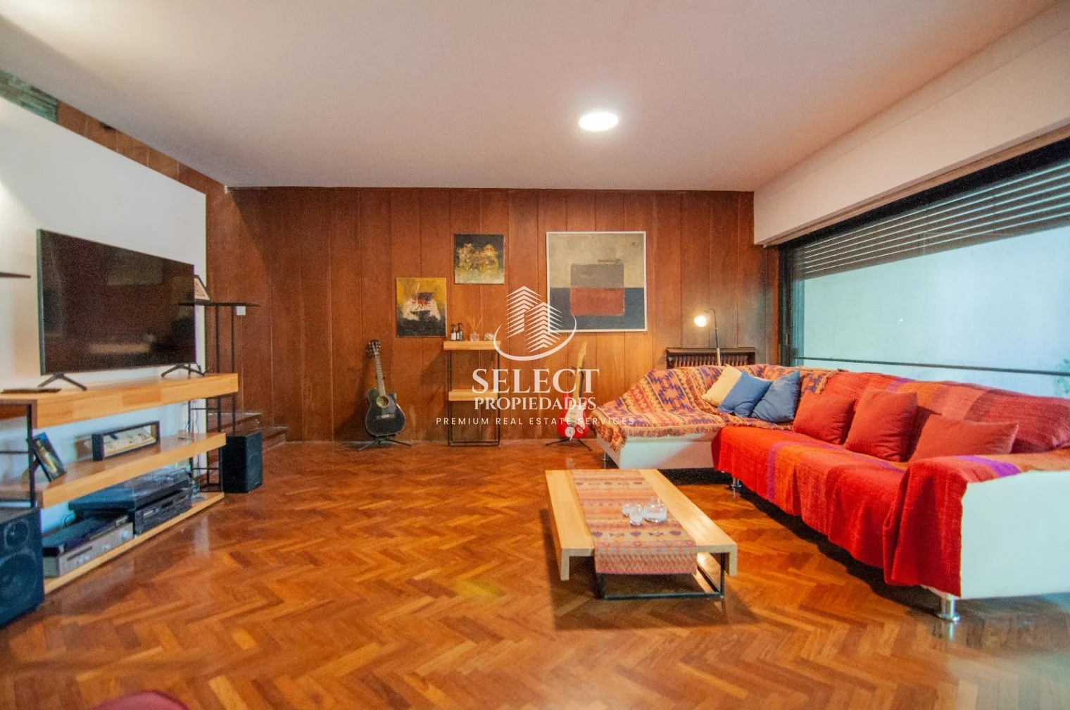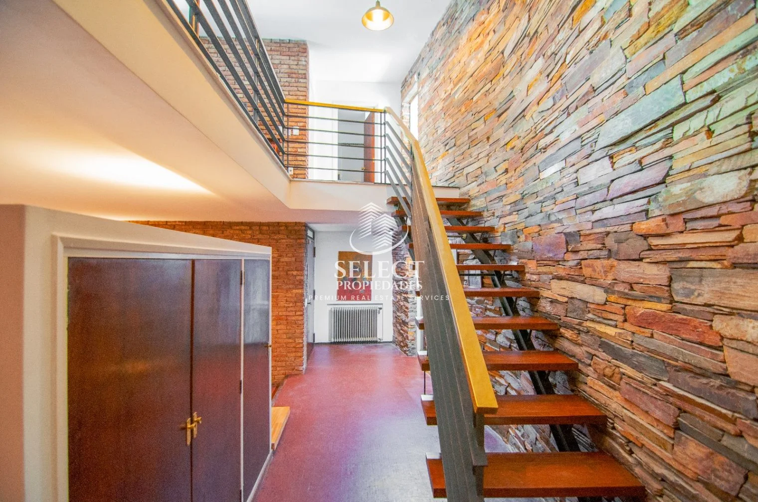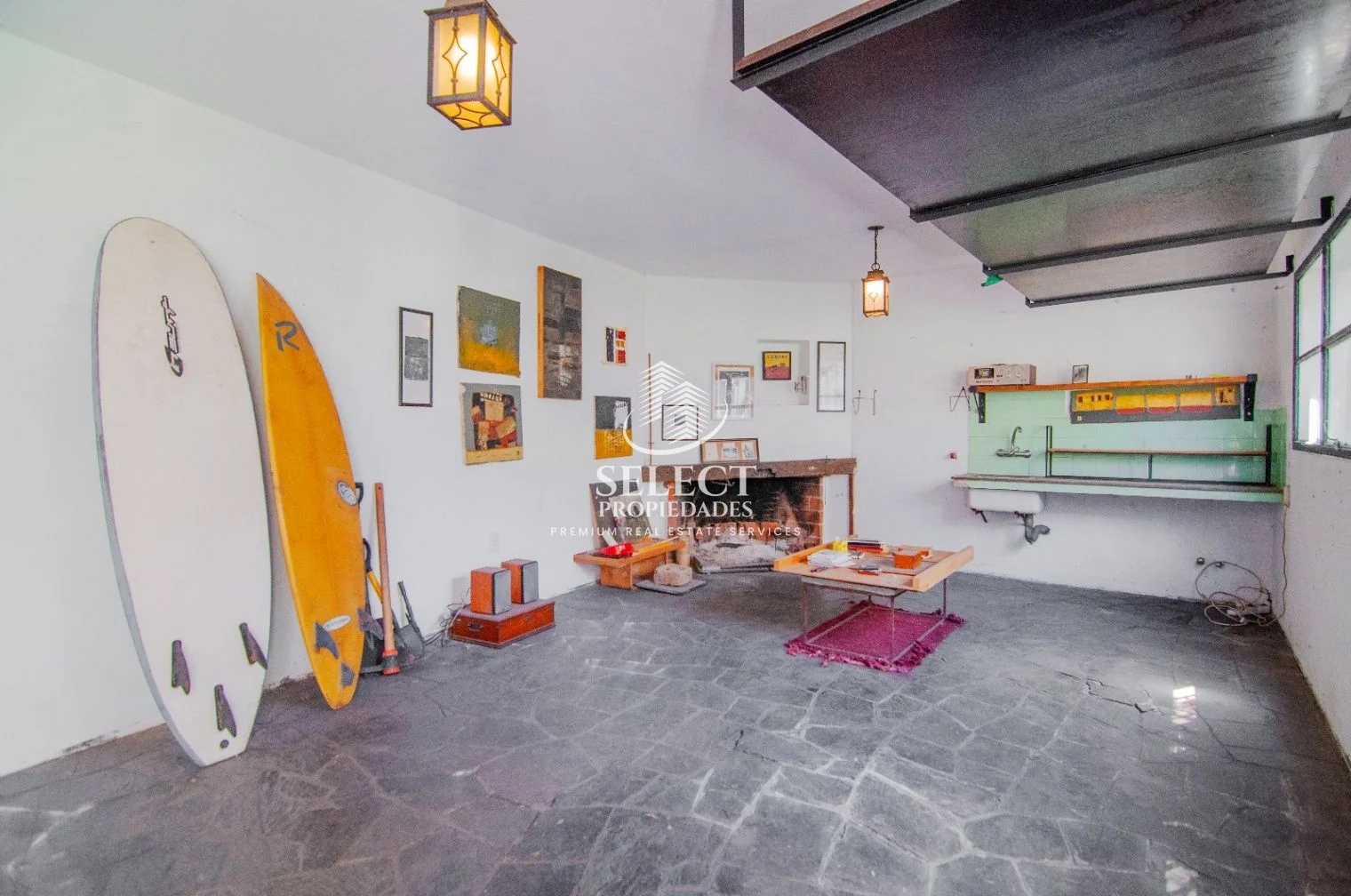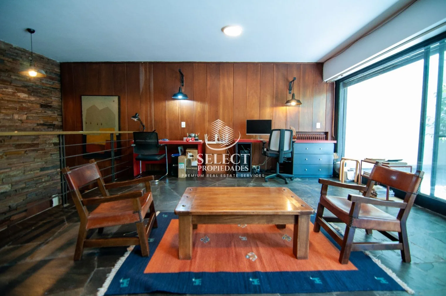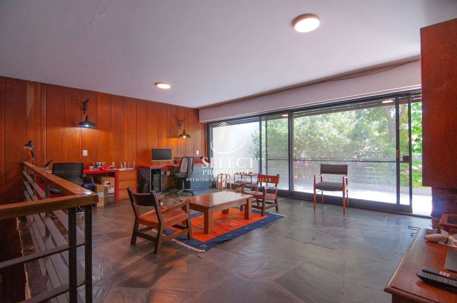 Ambiente amplio y versátil con estufa a leña, ventanales de piso a techo y salida a gran terraza con orientación norte. Pisos de piedra laja y continuidad del estilo rústico y noble del living principal.