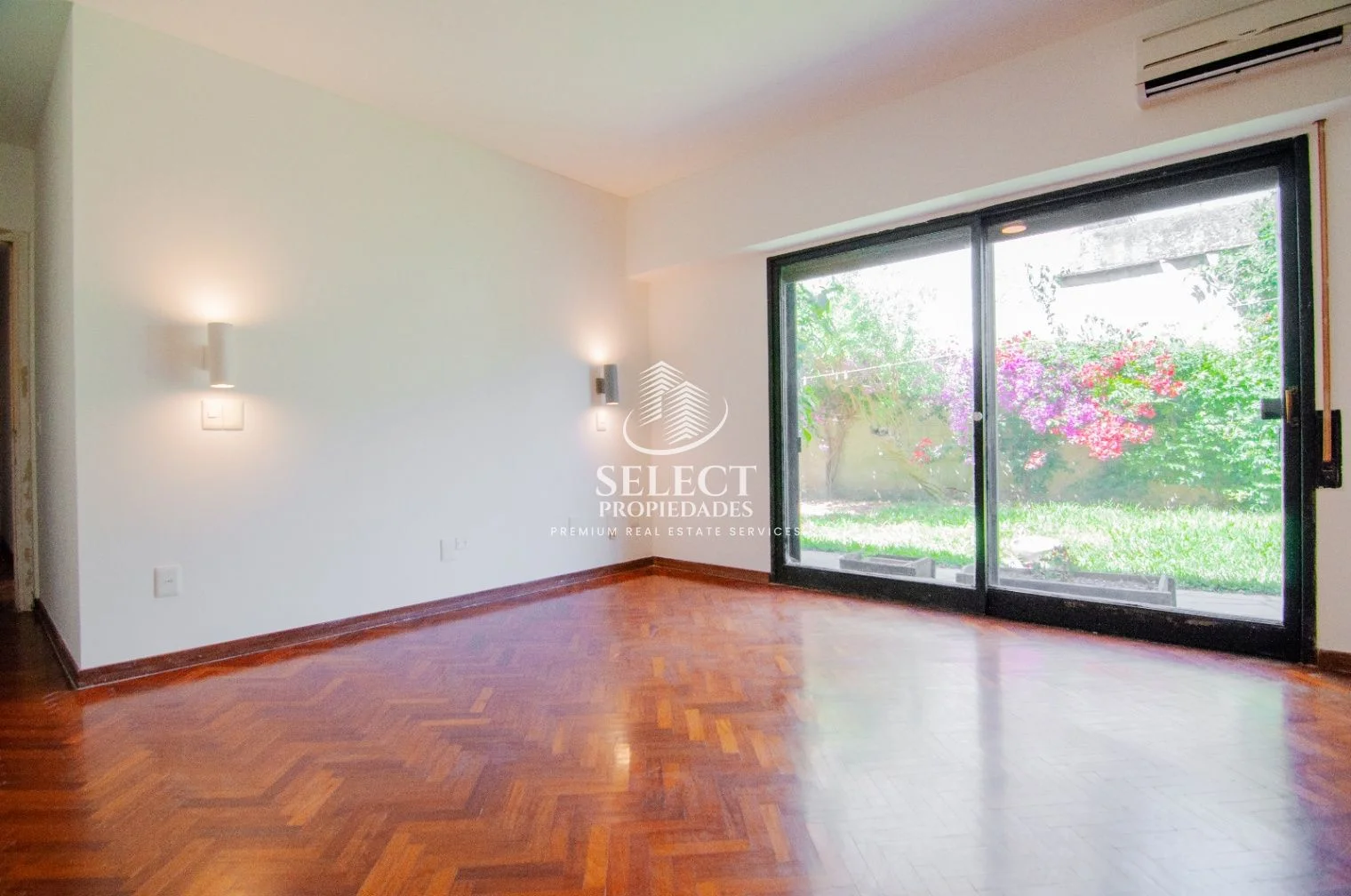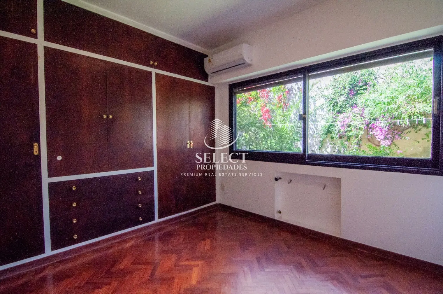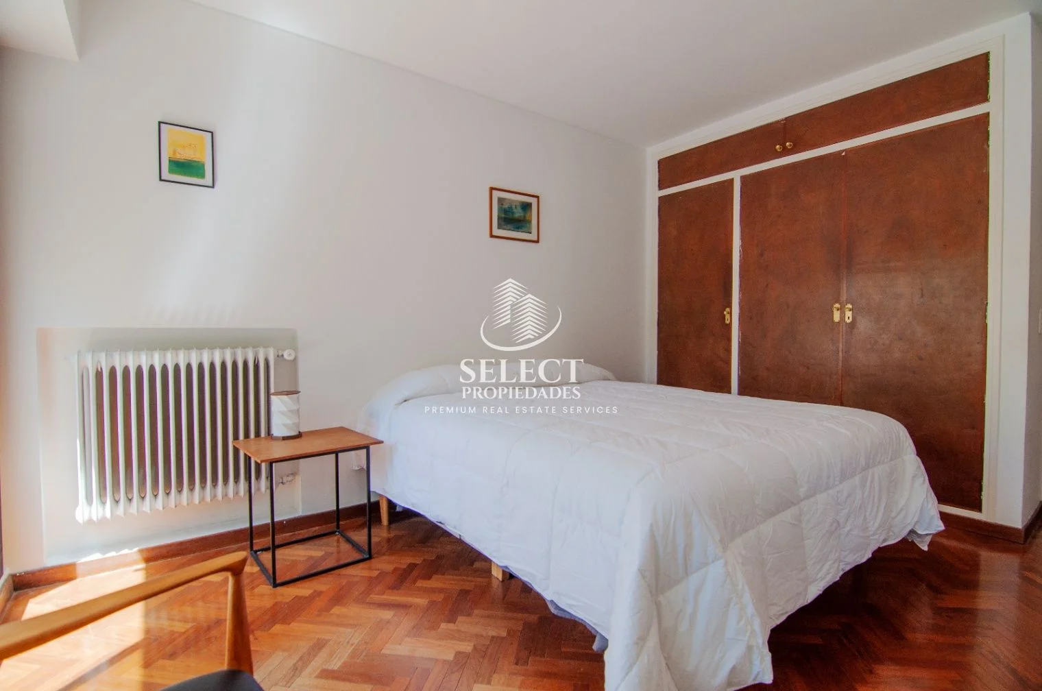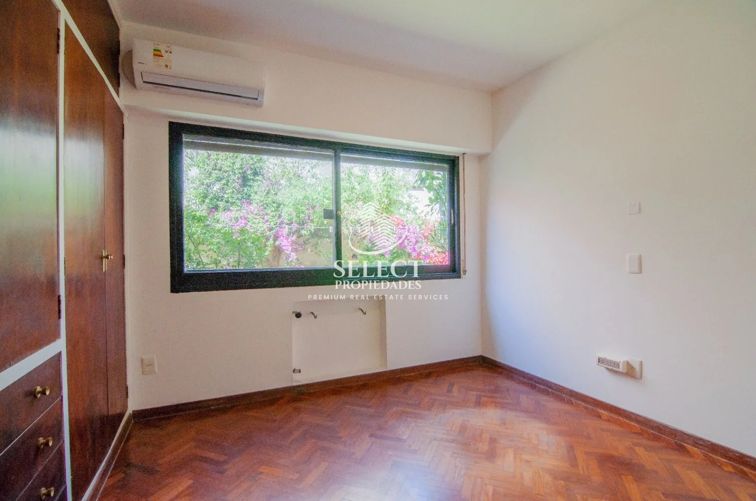 Cuarto dormitorio con buena iluminación natural, aire acondicionado, placard empotrado y pisos de parquet.