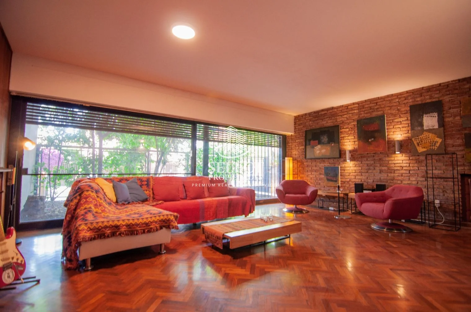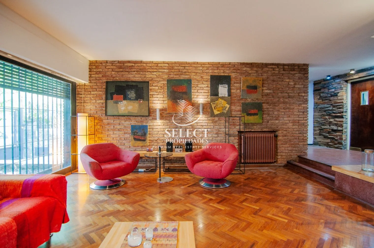 Ingresamos a muy amplio living con grandes ventanales al frente. Ambiente que combina ladrillo visto, madera y piedra. Pisos de parquet de lapacho.