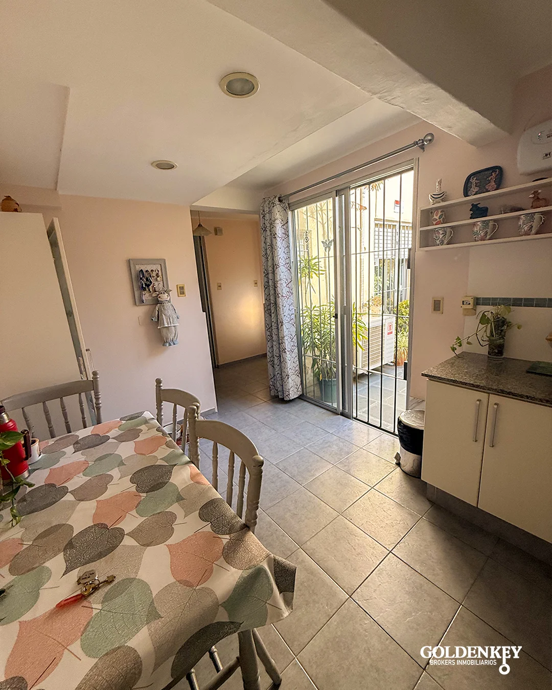 Cocina comedor amplia y luminosa con muebles aéreos y bajo mesada en MDF y salida a patio con parrillero por puerta ventana en aluminio con rejas.