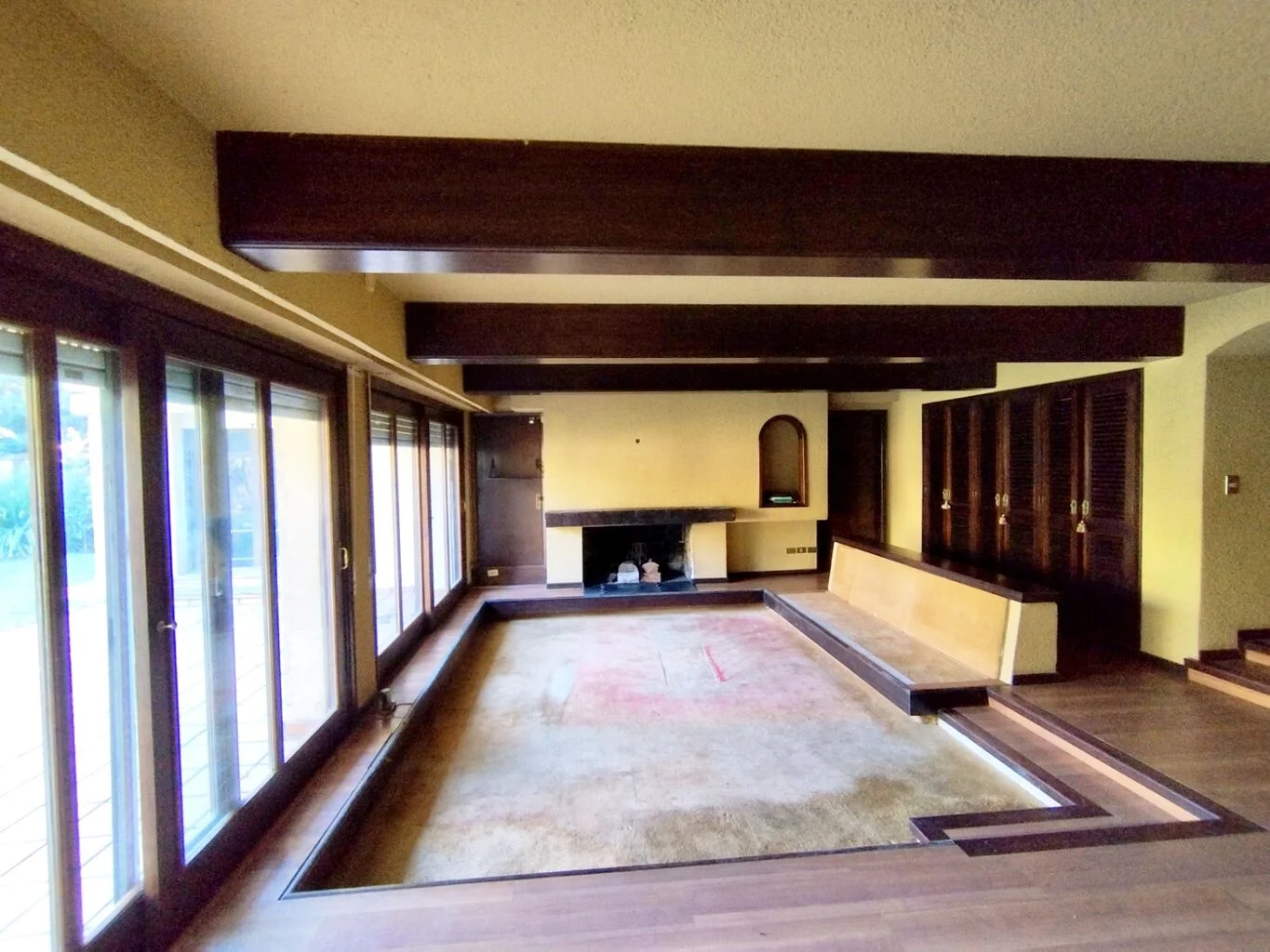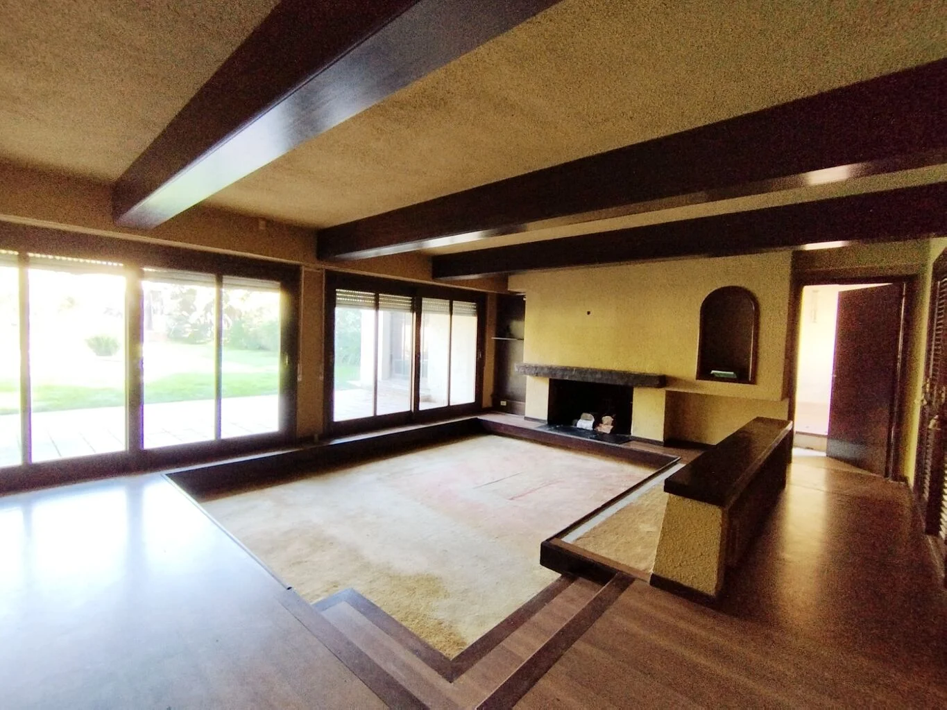 Gran estar con estufa leña con amplios ventanales que integra la terraza y el fondo, comedor diario.