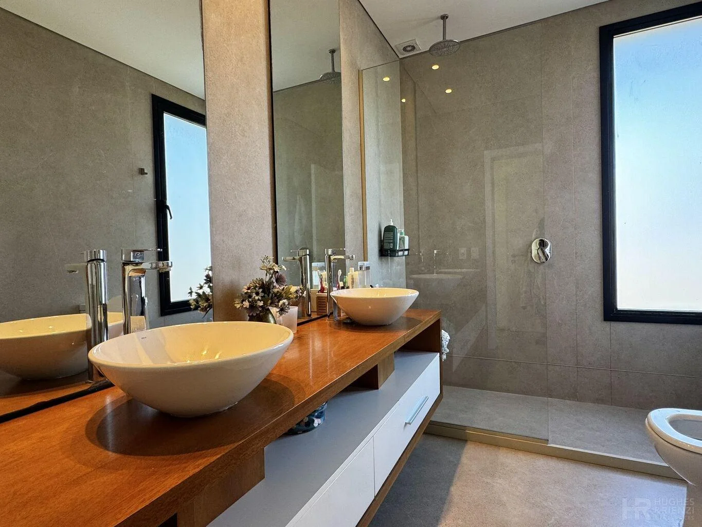 En planta alta, área de escritorio, 3 dormitorios de muy buen tamaño y 2 baños completos, principal en suite con vestidor.