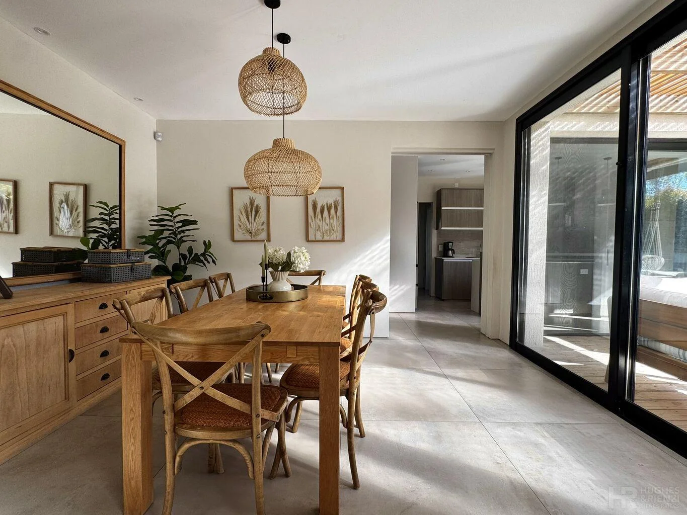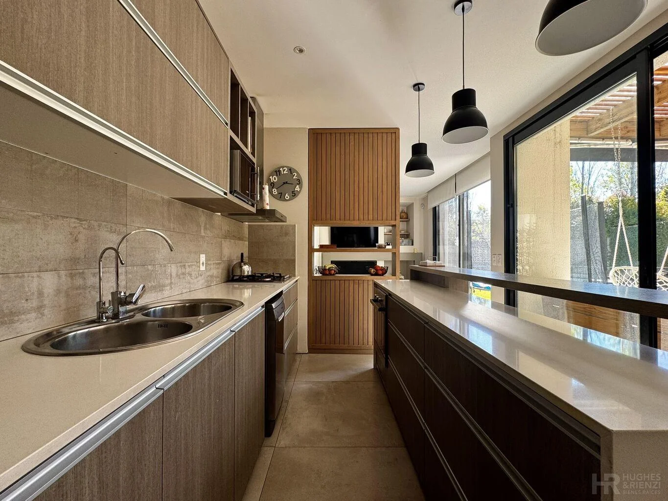 Living comedor, cocina y estar diario con estufa a leña, todo orientado al fondo.
