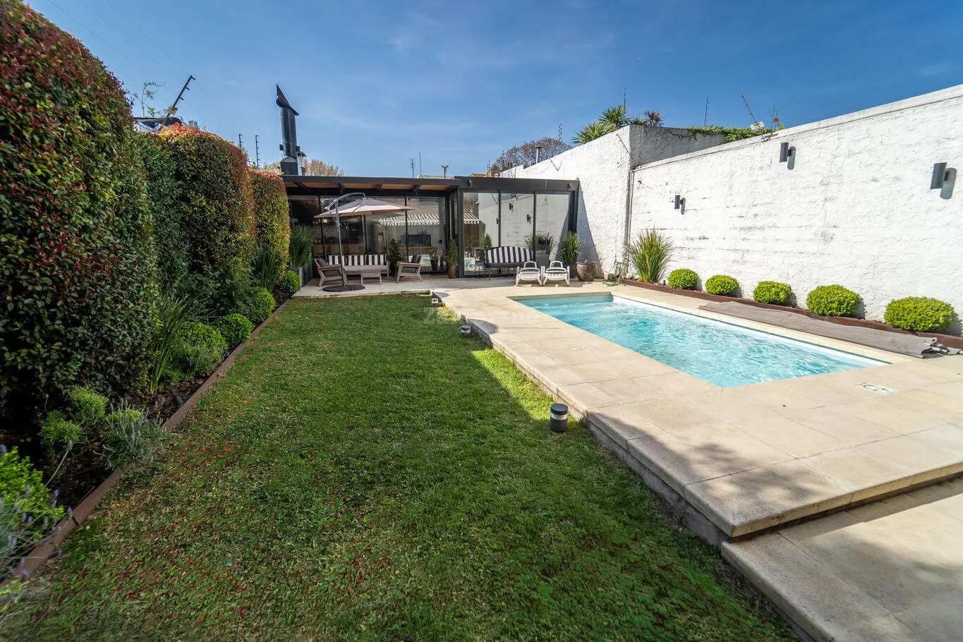Tiene un jardín divino con mucho verde, piscina climatizada y una barbacoa cerrada, para hacer unos buenos asados.