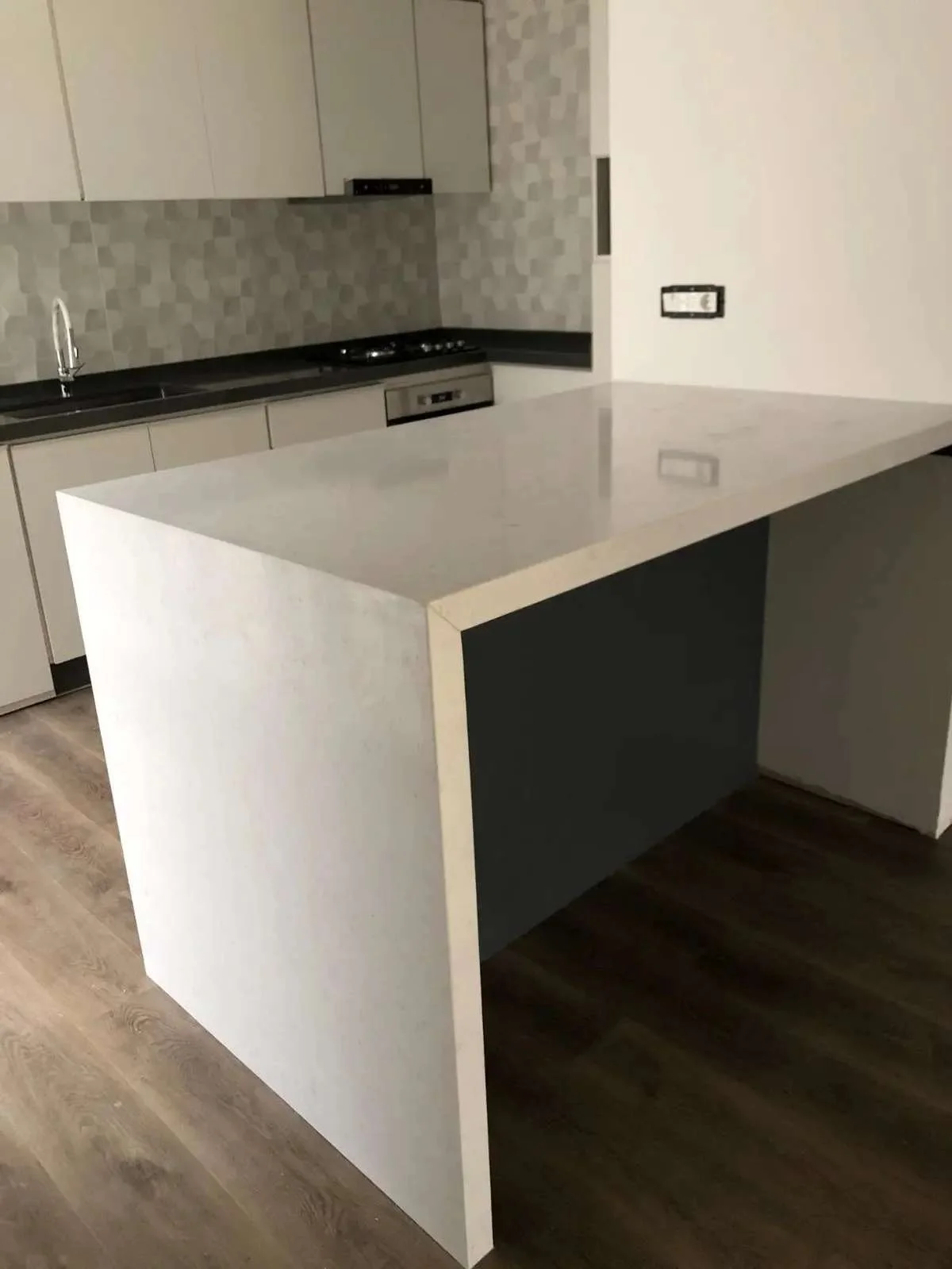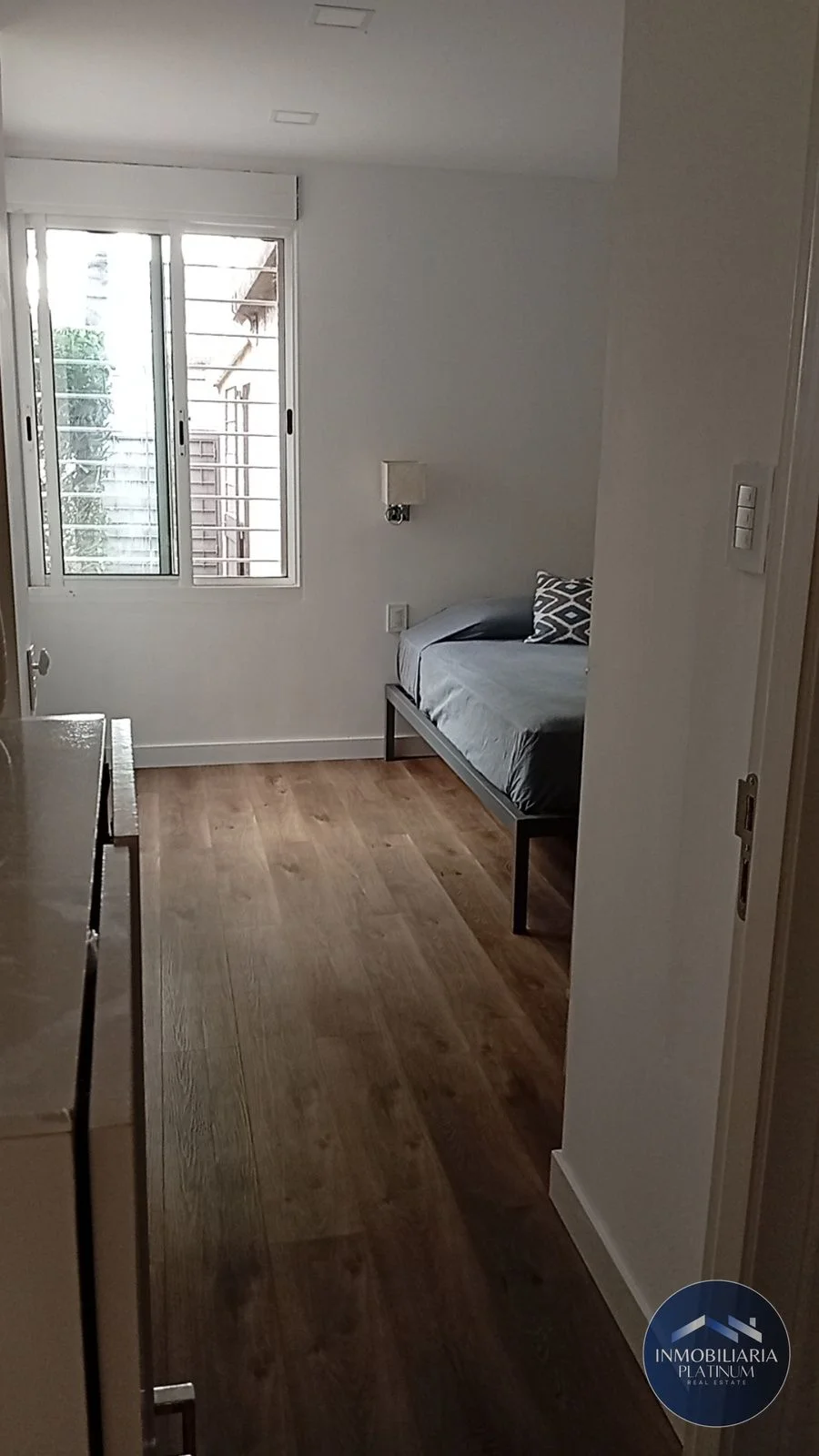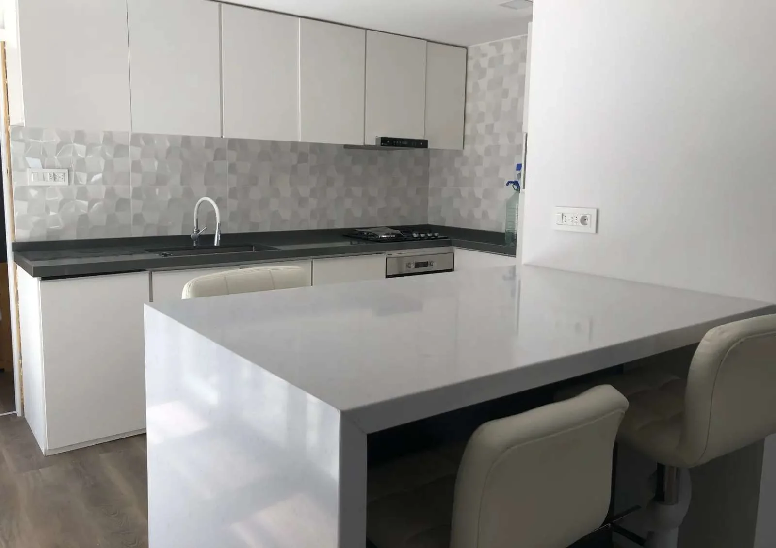 La cocina cuenta con conexión para lavavajillas, una amplia pileta, campana, horno empotrado y anafe. Es cómoda y luminosa con gran capacidad de almacenamiento dada por muebles a medida construidos en melamínico blanco.