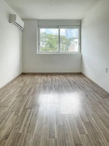 Unidad equipada con aire acondicionado, placares sobre y bajo mesada en cocina y baño.