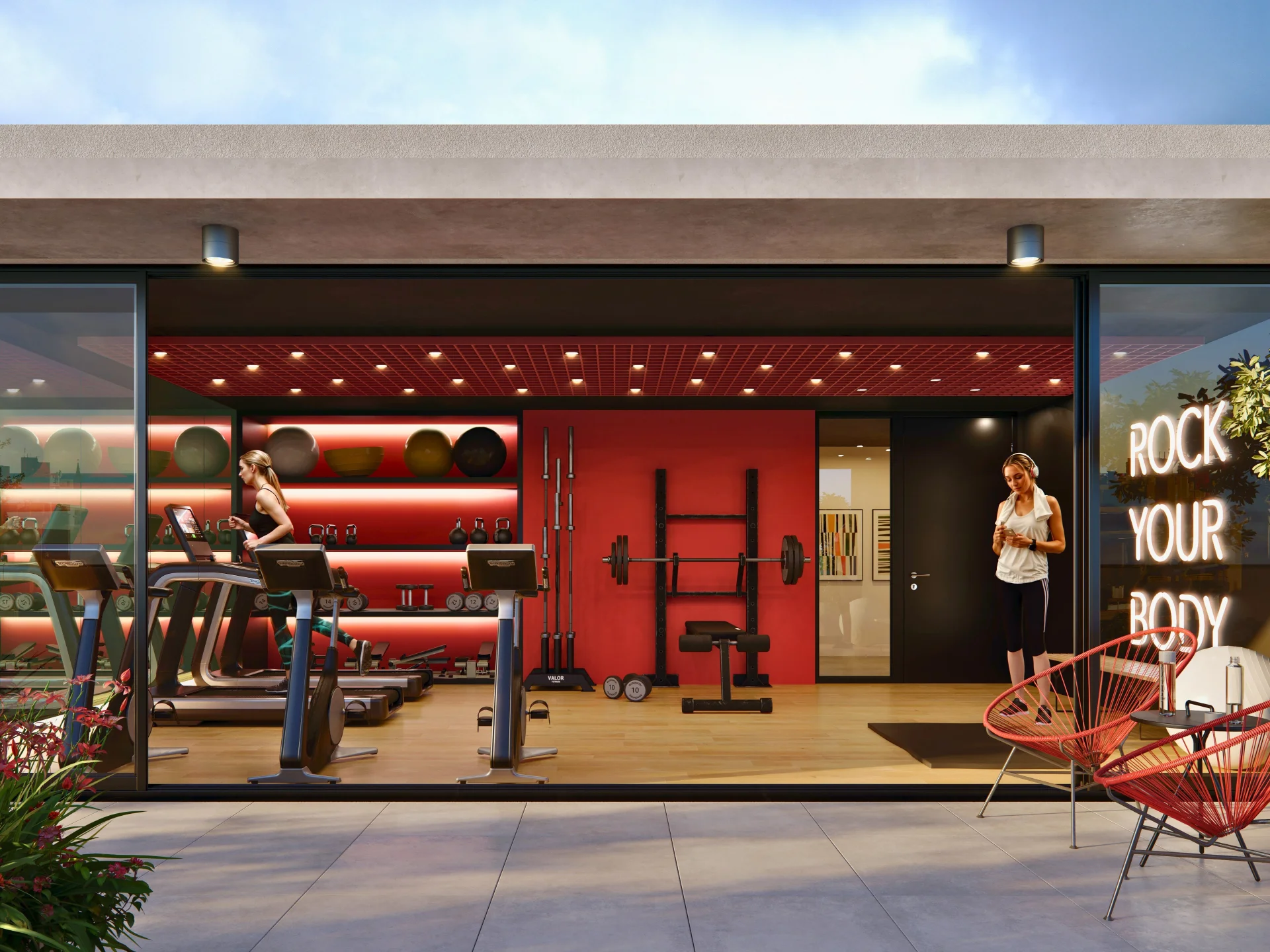 En el último piso, se encuentra una terraza con una vista panorámica del skyline de la ciudad. Este espacio alberga los siguientes amenities: