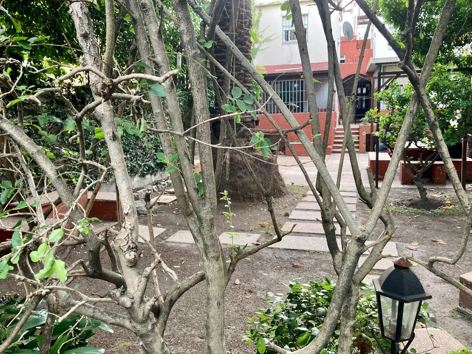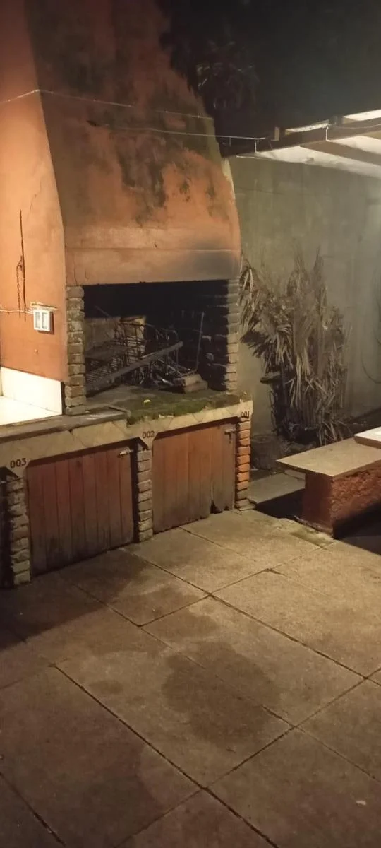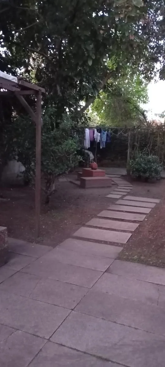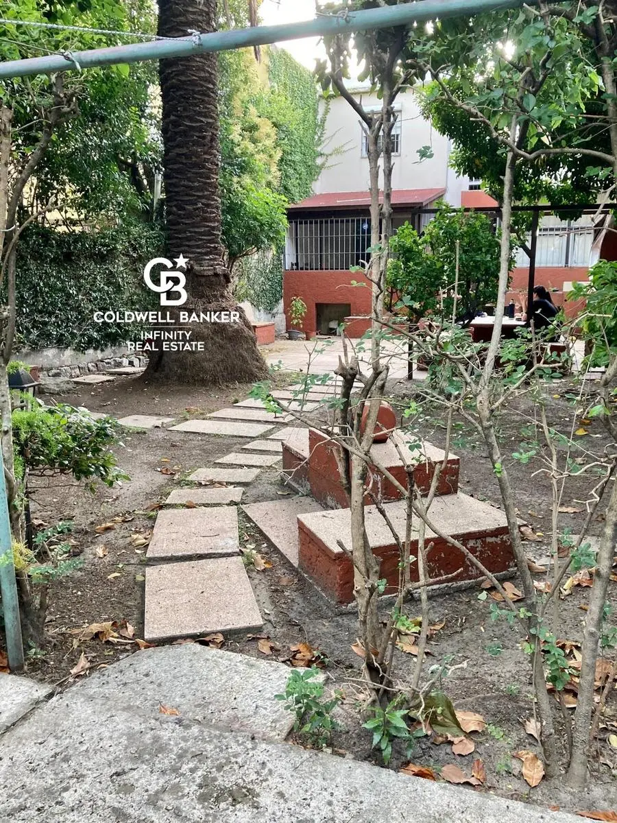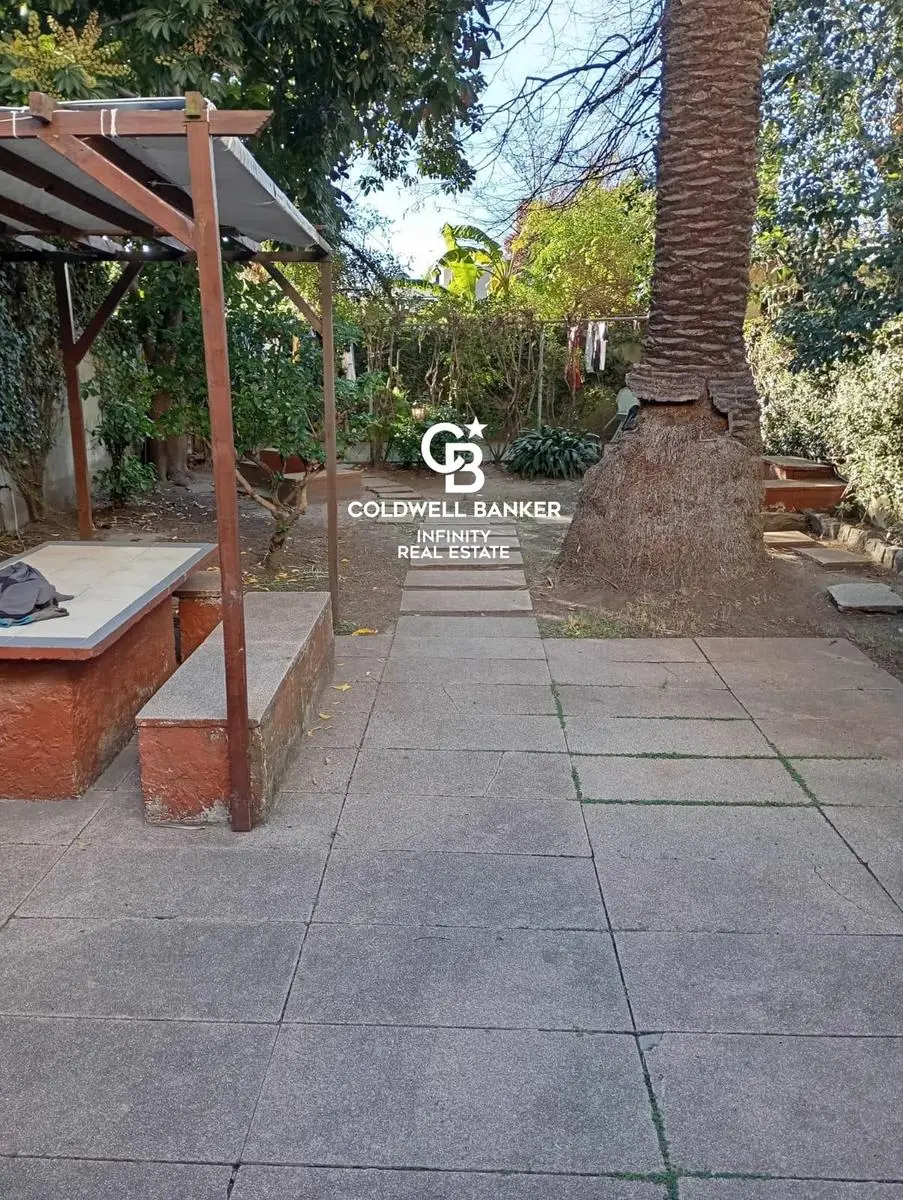 Fondo para el disfrute en común, completamente cercado de muros con pérgola de madera, bancos y parrillero.