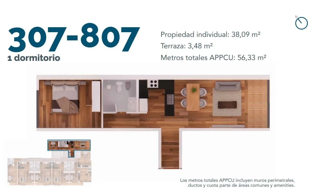 4º piso al frente, living comedor con cocina integrada mediante barra, 1 dormitorio y 1 baño.
