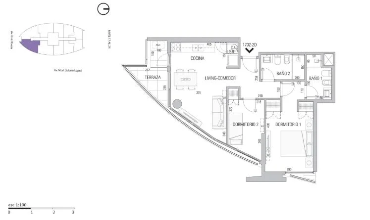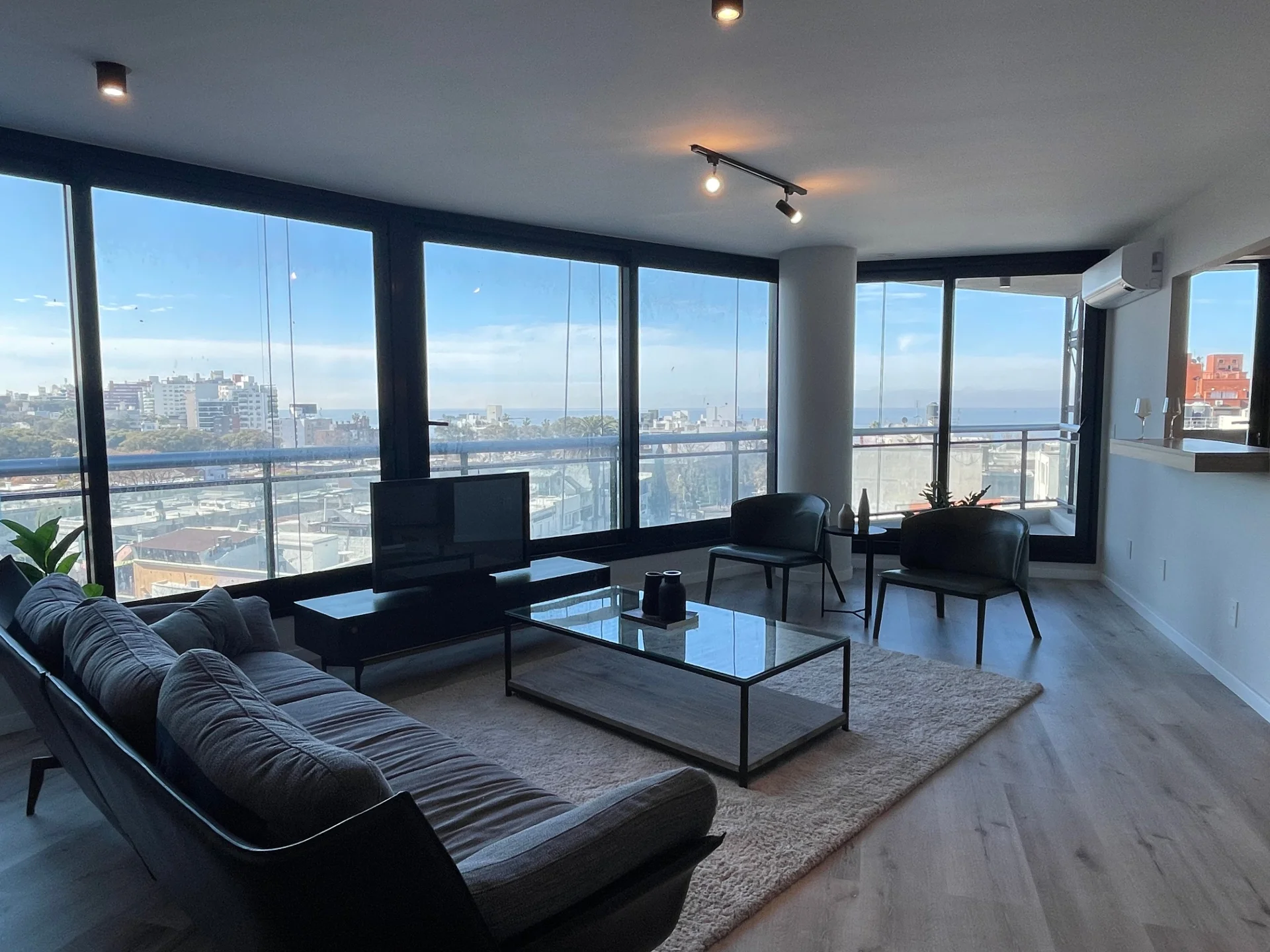 Este apartamento se encuentra en el piso 24, lo que garantiza impresionantes vistas panorámicas de la ciudad y el océano. Gracias a sus ventanales de piso a techo, la luz natural se convierte en un protagonista constante en cada ambiente. La distribución del apartamento es moderna y funcional, con un amplio living-comedor que conecta perfectamente con las vistas y la cocina definida, que cuenta con muebles de alta calidad y espacio para almacenamiento.