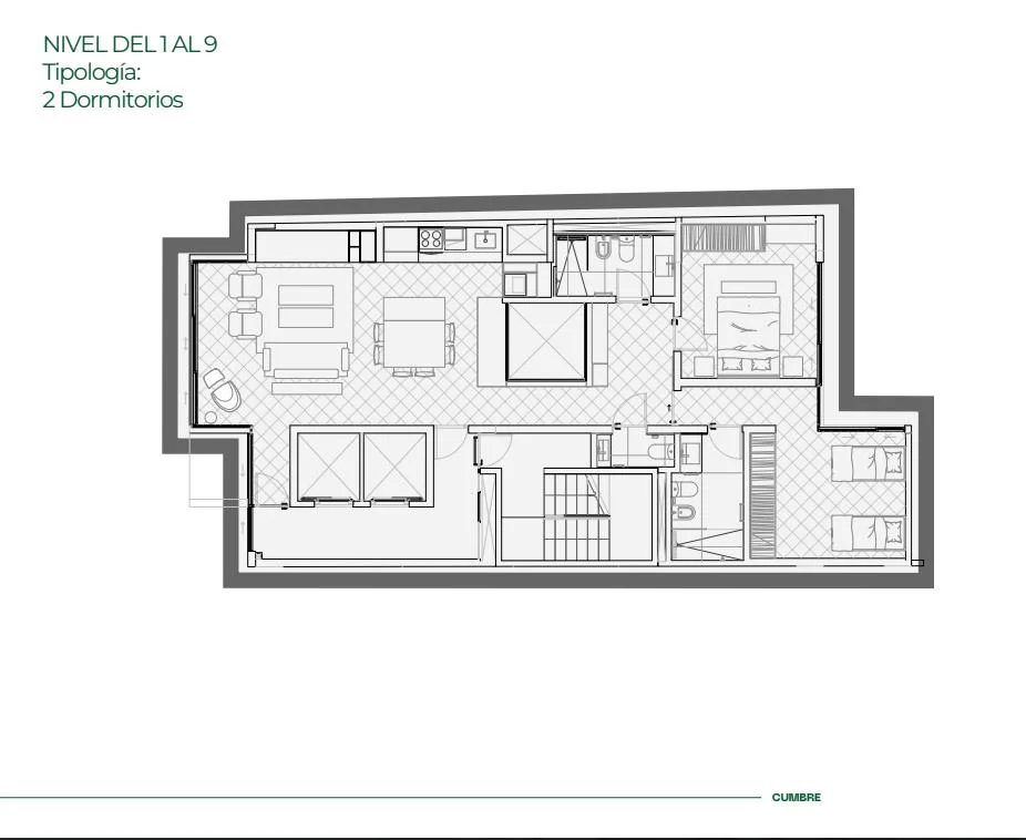El edificio se diseñó con una volumetría innovadora, creando un tragaluz central que conecta y equilibra las áreas privadas y públicas de cada apartamento. Este detalle arquitectónico no solo realza la estética del espacio sino que también maximiza la entrada de luz natural, creando un ambiente más luminoso y acogedor en todo el hogar.