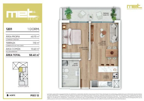 El apartamento cuenta con living comedor con acceso terraza de uso exclusivo, cocina integrada con mesada y aéreos.1 dormitorio. Baño completo.