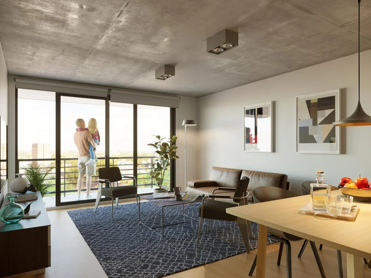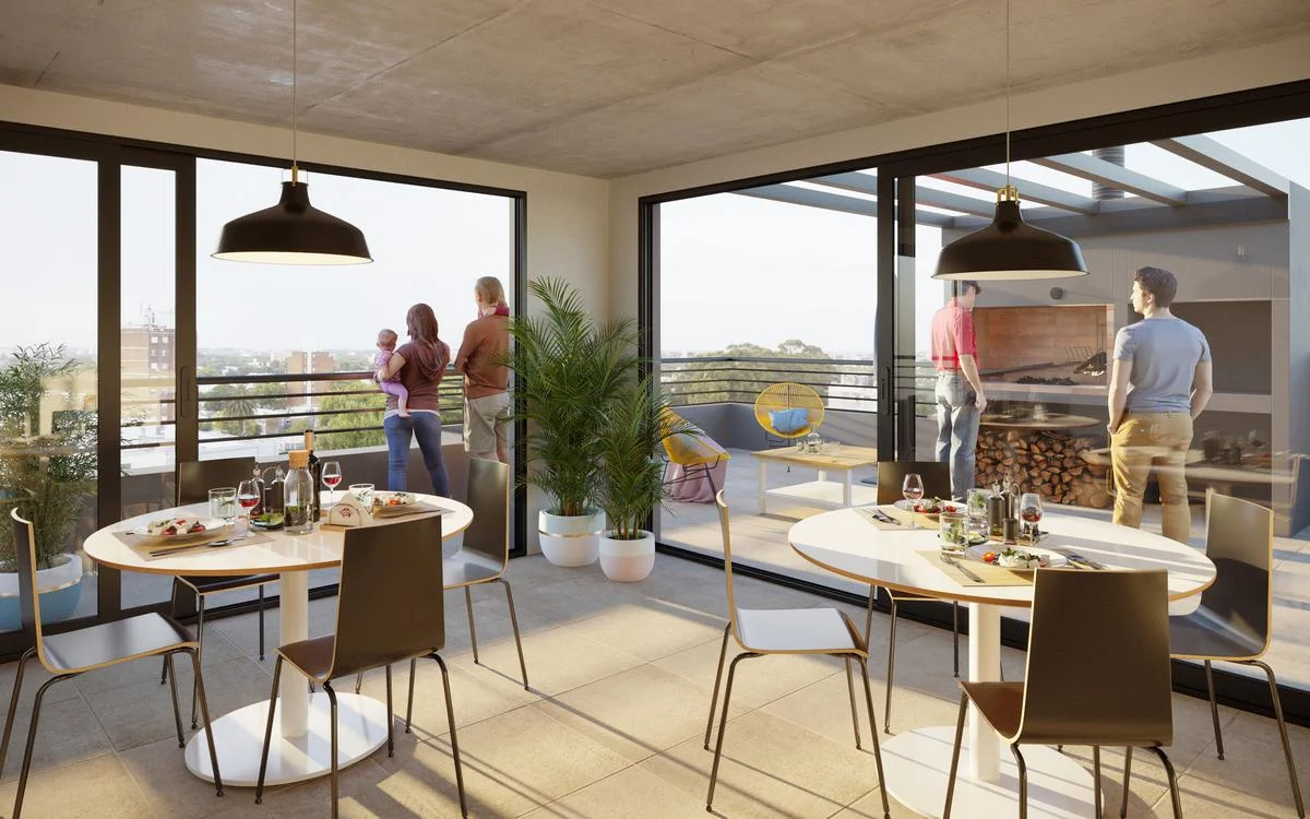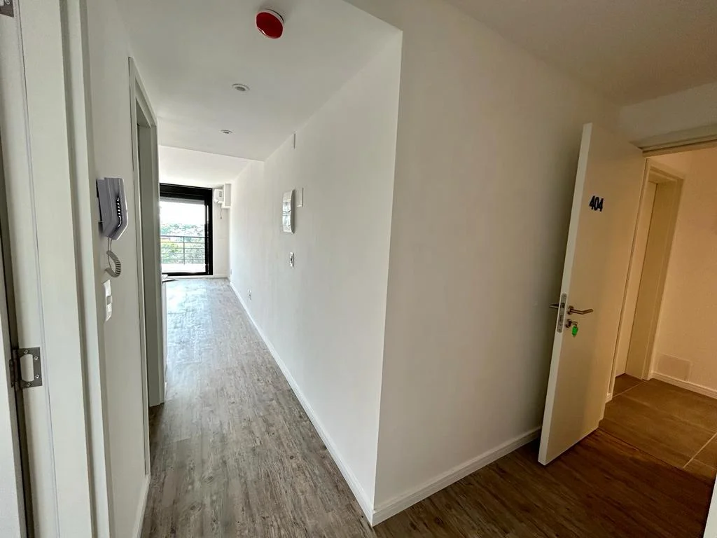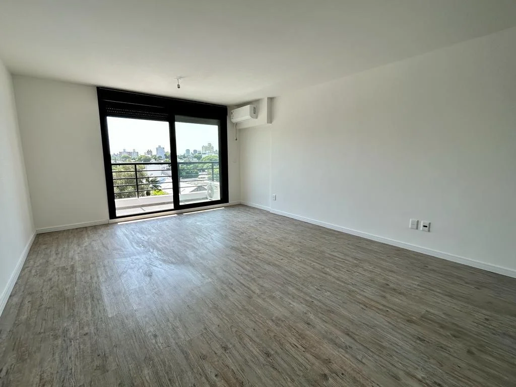 Living comedor con salida a terraza, cocina integrada con muebles bajo mesada y aéreos. Incluye horno, anafe y campana.